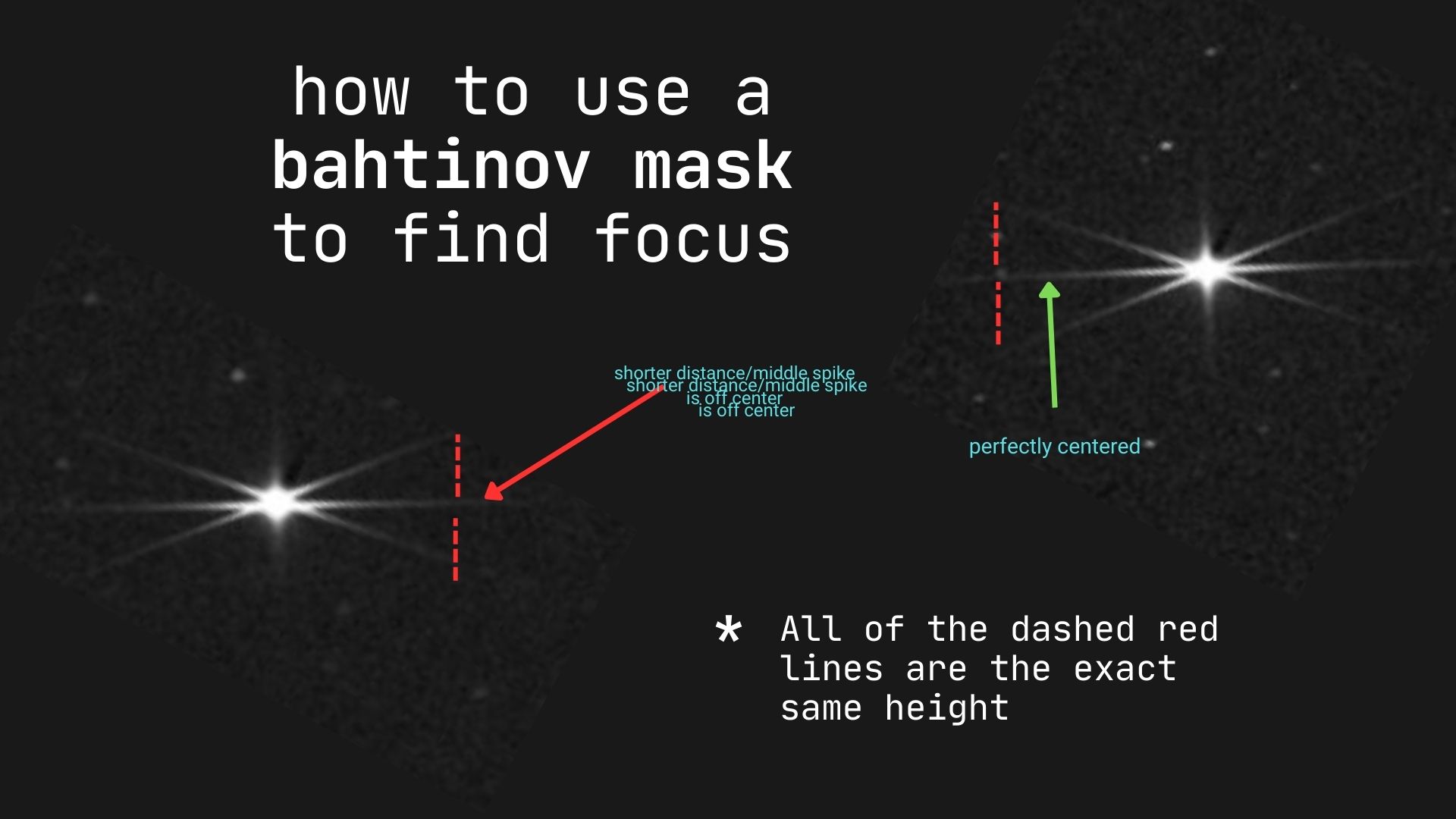 A Bahtinov mask contains a special pattern that creates diffraction spikes in your image. The spikes move as you change the focus. Perfect focus happens when the central spike is positioned in the exact center of the other two spikes. If you are like me, you might have tried to find focus by “zeroing in” on what looks like the sharpest image. This technique is much easier to visualize and guarantees sharp focus if you are able to align the spikes.