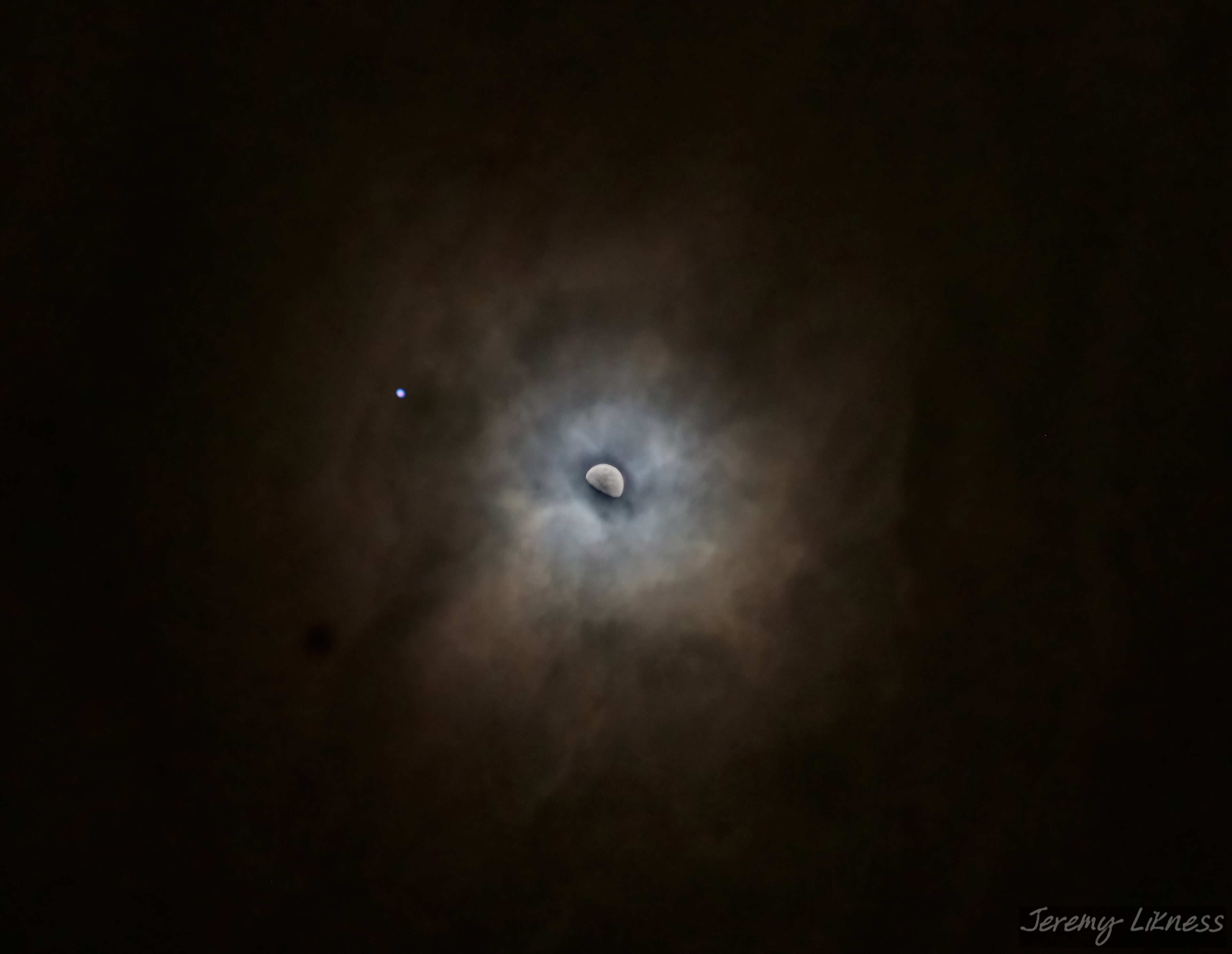 I had to use a longer exposure (~four seconds) for the detail of the clouds to show, but that left the moon as a washed-out bright blob of light. I took another exposure at a fraction of a second to get the details of the moon, then blended the two together.