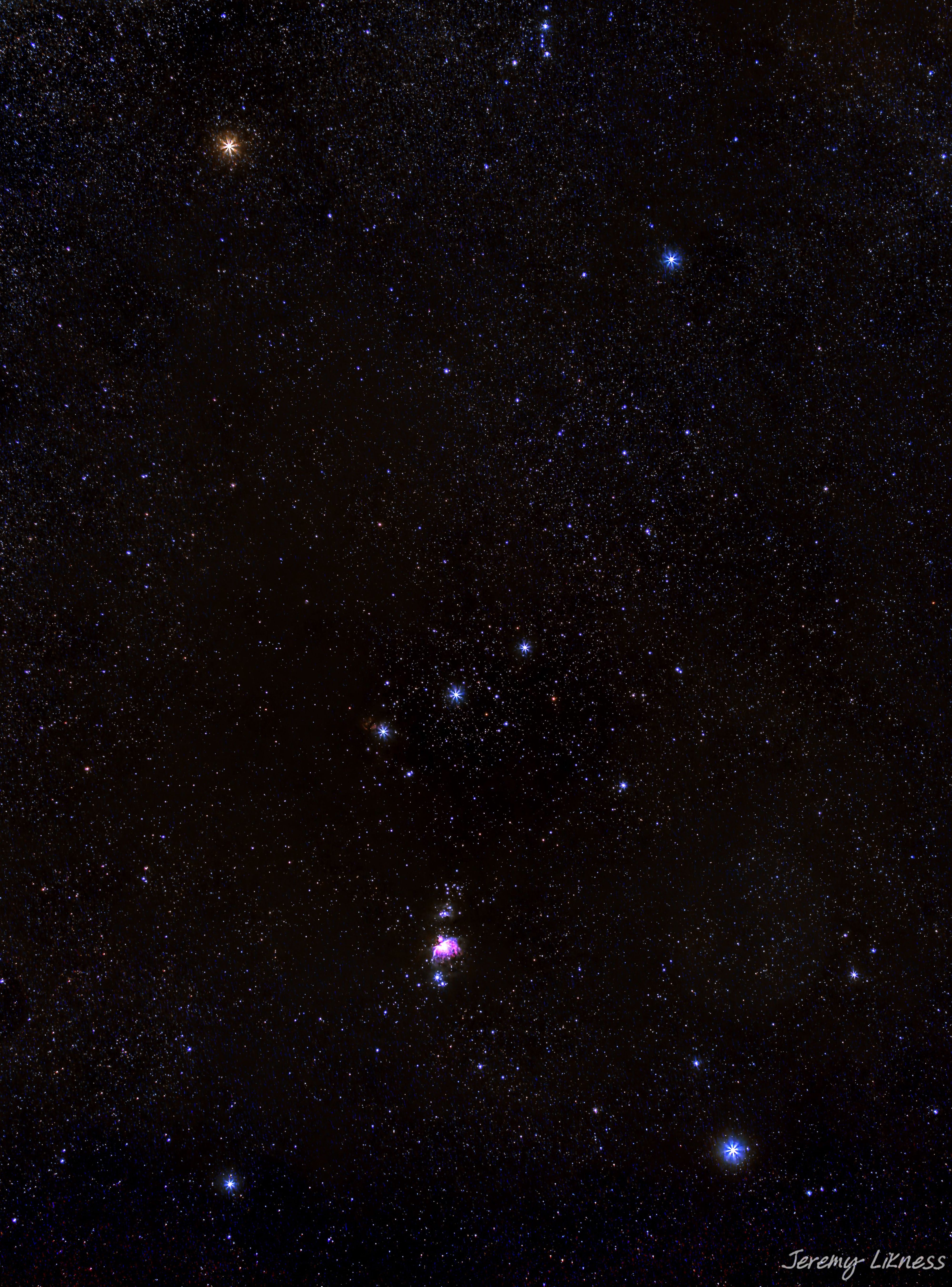 For example, this photograph of the Orion constellation was taken at a focal length of 50mm and has a field of view of 13 degrees. Near the bottom center you can make out the purple outline of the Orion Nebula but there’s not much detail.