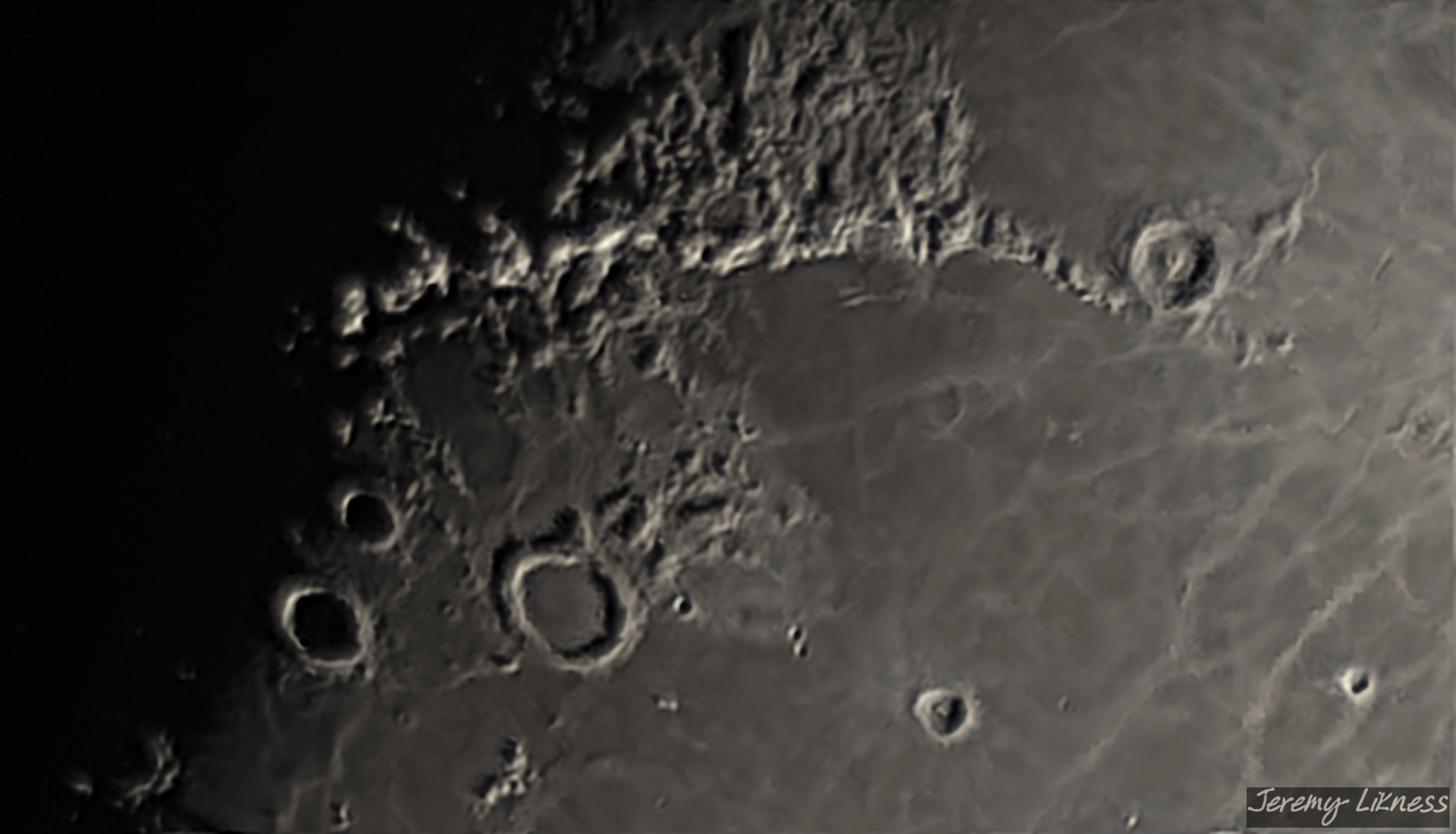 The prominent crater in the lower left is Archimedes. Apollo 15 landed 180km away. In the upper right is Cassini. It is distinct with two prominent 'sub craters' inside.