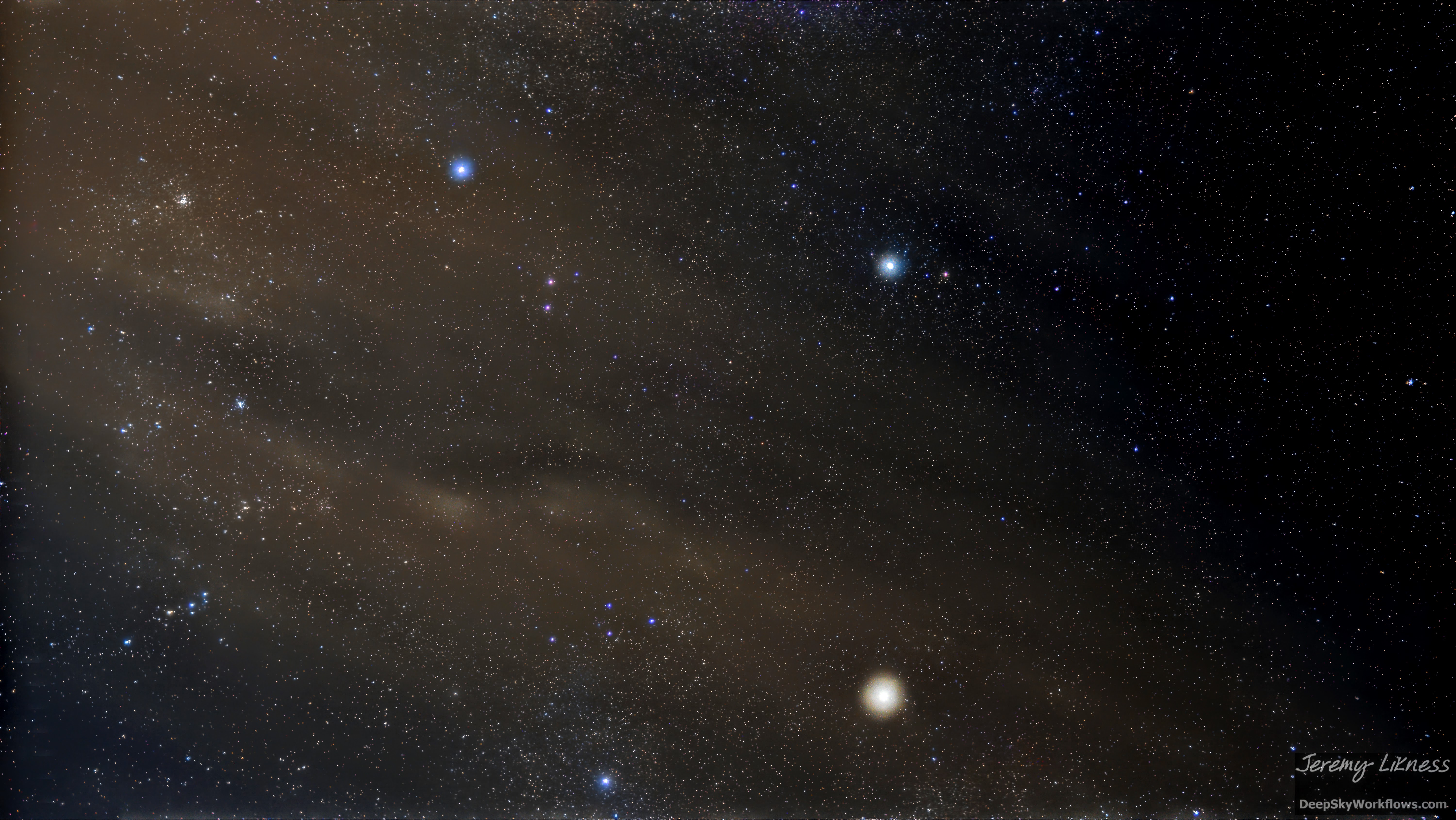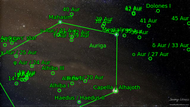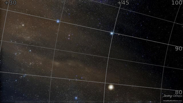 Brilliant Capella is low center in this starfield shot a 50mm with my camera riding piggyback on the main telescope. Blue stars Menkalinan and Bogardus connect with Capella to from the side of the 'modern constellation' Auriga that means 'Charioteer.' To the left is the string of star clusters (M36, M37, and M38). The blue stars to the lower left mark IC405, the Flame Nebula (not visible at such a short exposure).