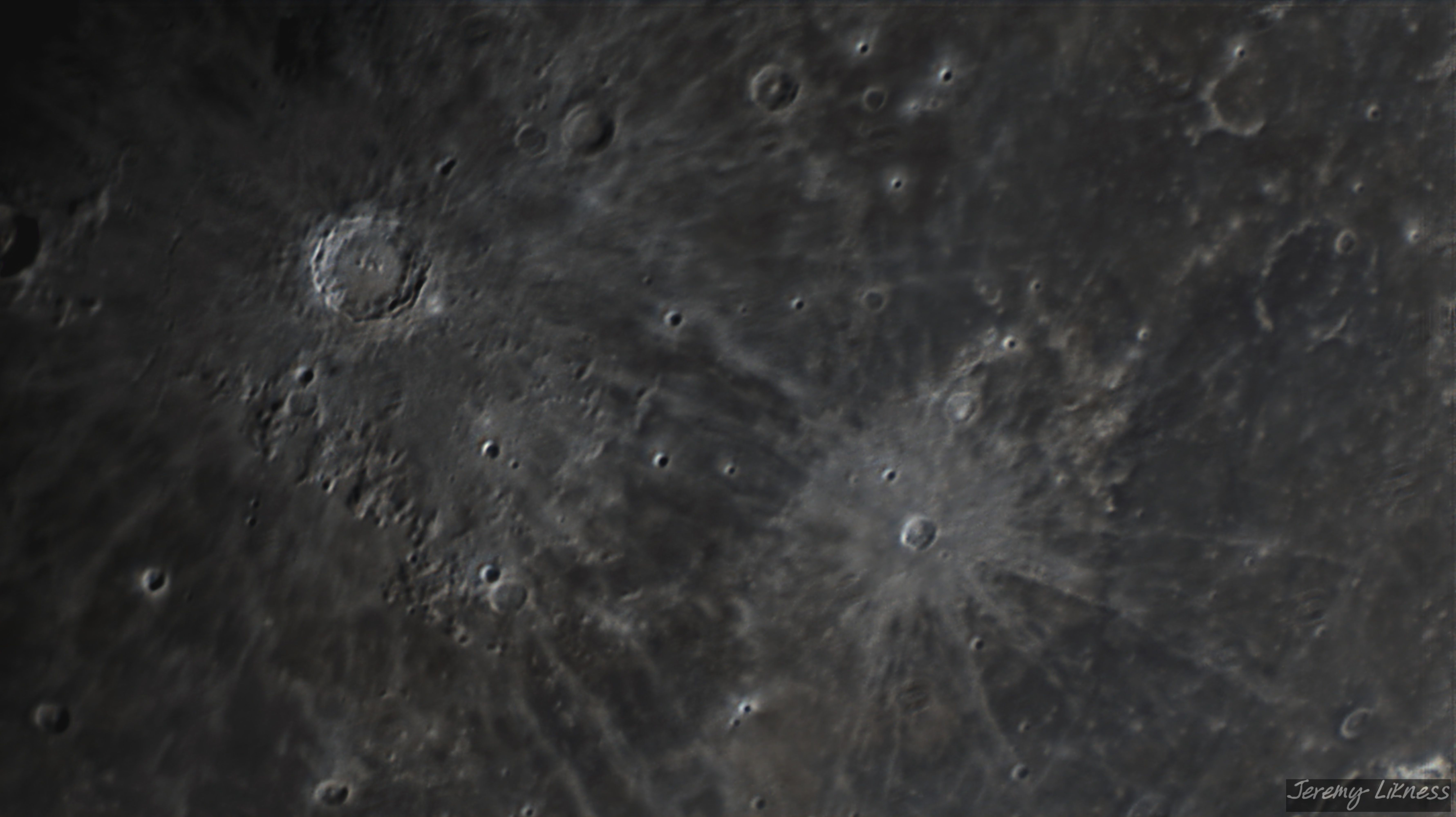Copernicus is a prominent crater easily visible at a distance due to the bright ejecta radiating from the center of impact. The interior is marked by distinctive peaks and the rim has collapsed and eroded in sections. The the right, Kepler is surrounded by rays that extend 500km across the lunar surface.
