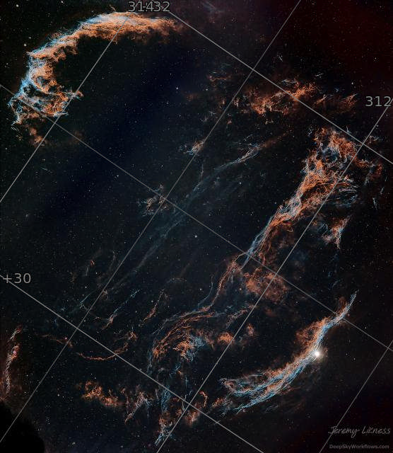 In the Southern Cross (or Cygnus) where a star no longer glows, Its energy loans the colorful bones that filaments expose / Threads of red and strands of green entangle in their space, The expanding shell of the star that fell and is no longer in its place. The Witch's Broom as some presume is just part of a bigger tale / Of Cirrus clouds, Pickering's Triangle and the Eastern and Western Veil. In space it's stranded the filaments expanded and twisted around the core / That attracts our gaze as we trace the maze, both amazed and grateful yet more.