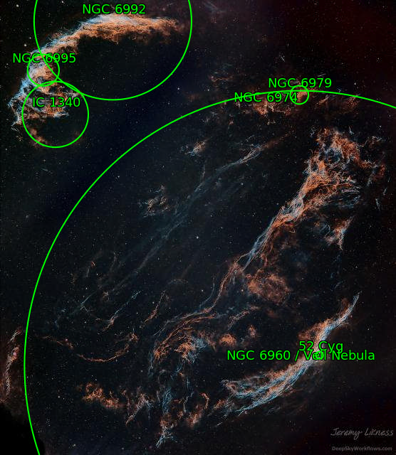 In the Southern Cross (or Cygnus) where a star no longer glows, Its energy loans the colorful bones that filaments expose / Threads of red and strands of green entangle in their space, The expanding shell of the star that fell and is no longer in its place. The Witch's Broom as some presume is just part of a bigger tale / Of Cirrus clouds, Pickering's Triangle and the Eastern and Western Veil. In space it's stranded the filaments expanded and twisted around the core / That attracts our gaze as we trace the maze, both amazed and grateful yet more.