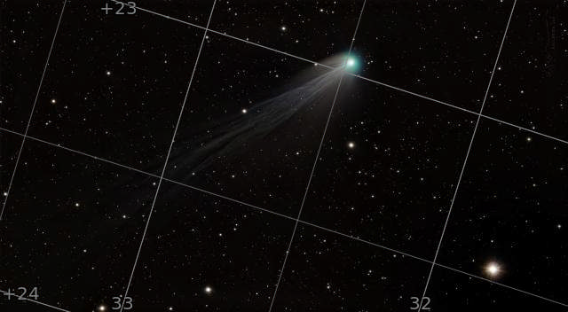 The Devil's Comet earned its nickname due to cryovolcanic activity. Explosions of gases have been observed and one image gave it a distinct horned aspect. Comet 12P/Pons-Brooks is periodic, with an orbit every 71 years, making it a Halley-type comet. This year it was especially bright. I only had a few hours to image it after dusk, so I used a fast HyperStar system from the deck of some friends with an ocean view to avoid obstructions on the horizon. The comet is known for having an amazingly long and intricately detailed tail. It is in close proximity to bright star Hamal that glows like a diamond, hence: the Devil's diamond.
