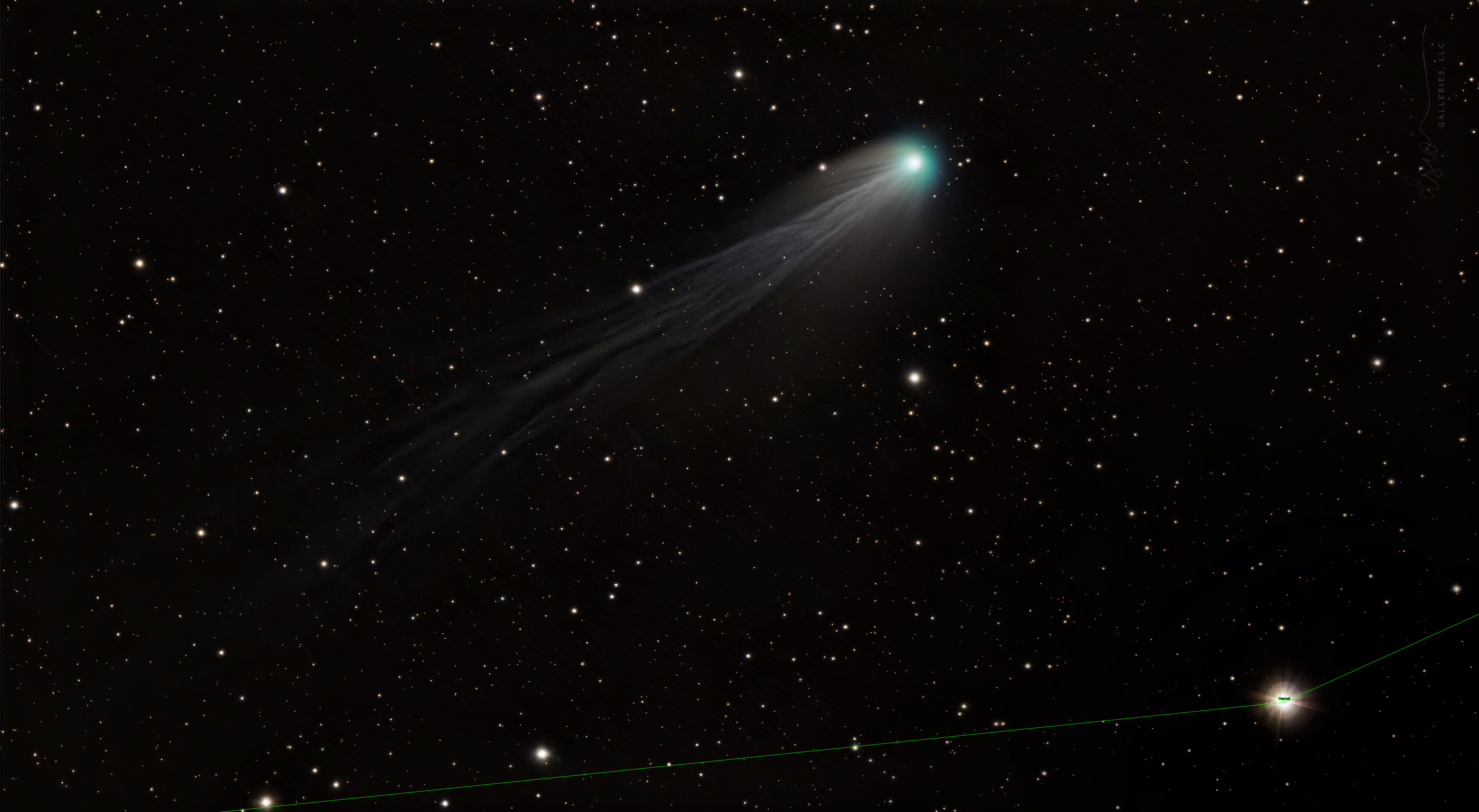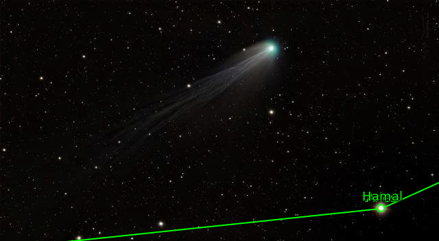 The Devil's Comet earned its nickname due to cryovolcanic activity. Explosions of gases have been observed and one image gave it a distinct horned aspect. Comet 12P/Pons-Brooks is periodic, with an orbit every 71 years, making it a Halley-type comet. This year it was especially bright. I only had a few hours to image it after dusk, so I used a fast HyperStar system from the deck of some friends with an ocean view to avoid obstructions on the horizon. The comet is known for having an amazingly long and intricately detailed tail. It is in close proximity to bright star Hamal that glows like a diamond, hence: the Devil's diamond.
