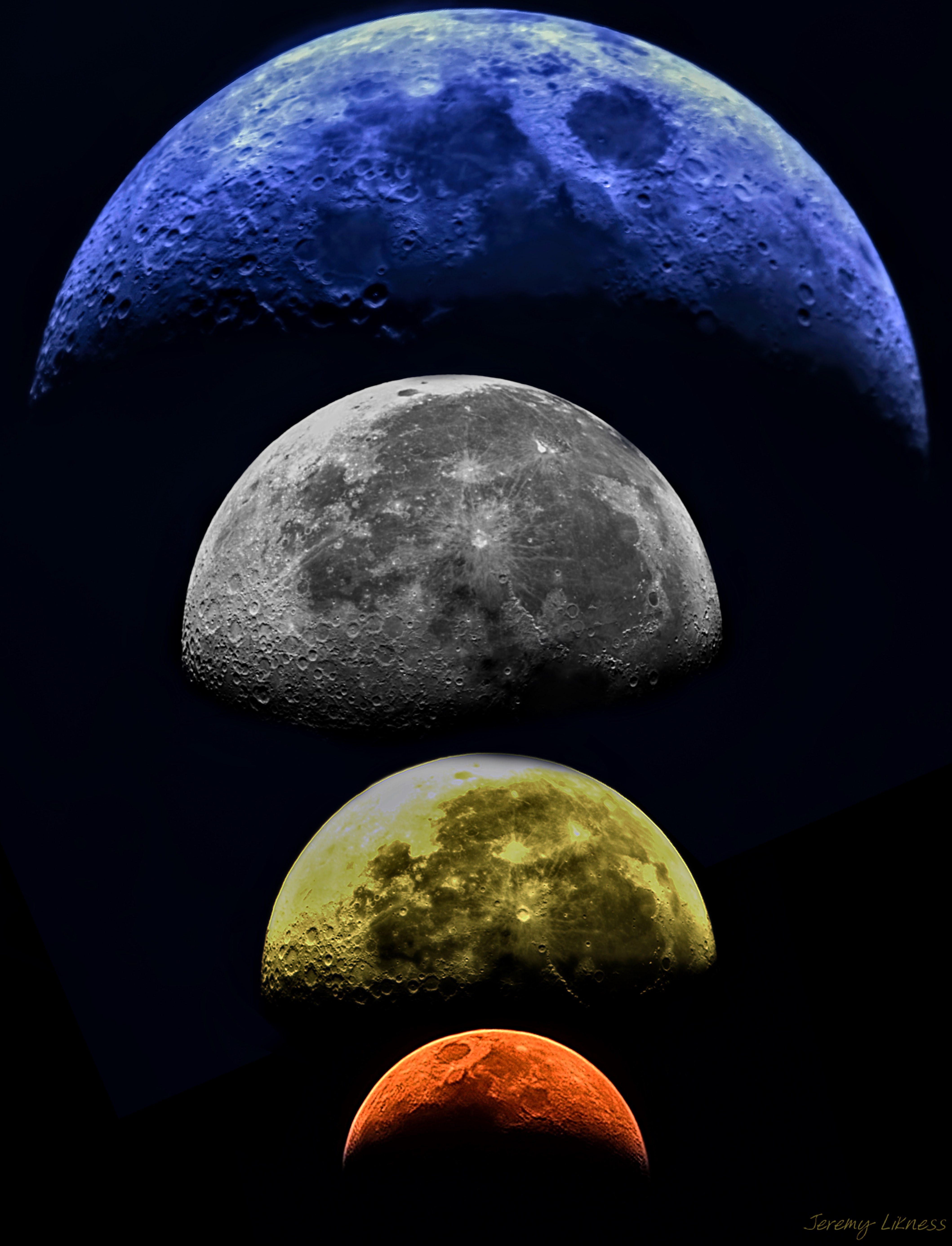 Four unfiltered images of the moon: a blue taken by day, a yellow due to fog, and a red due to forest fire smoke in addition to the traditional gray.