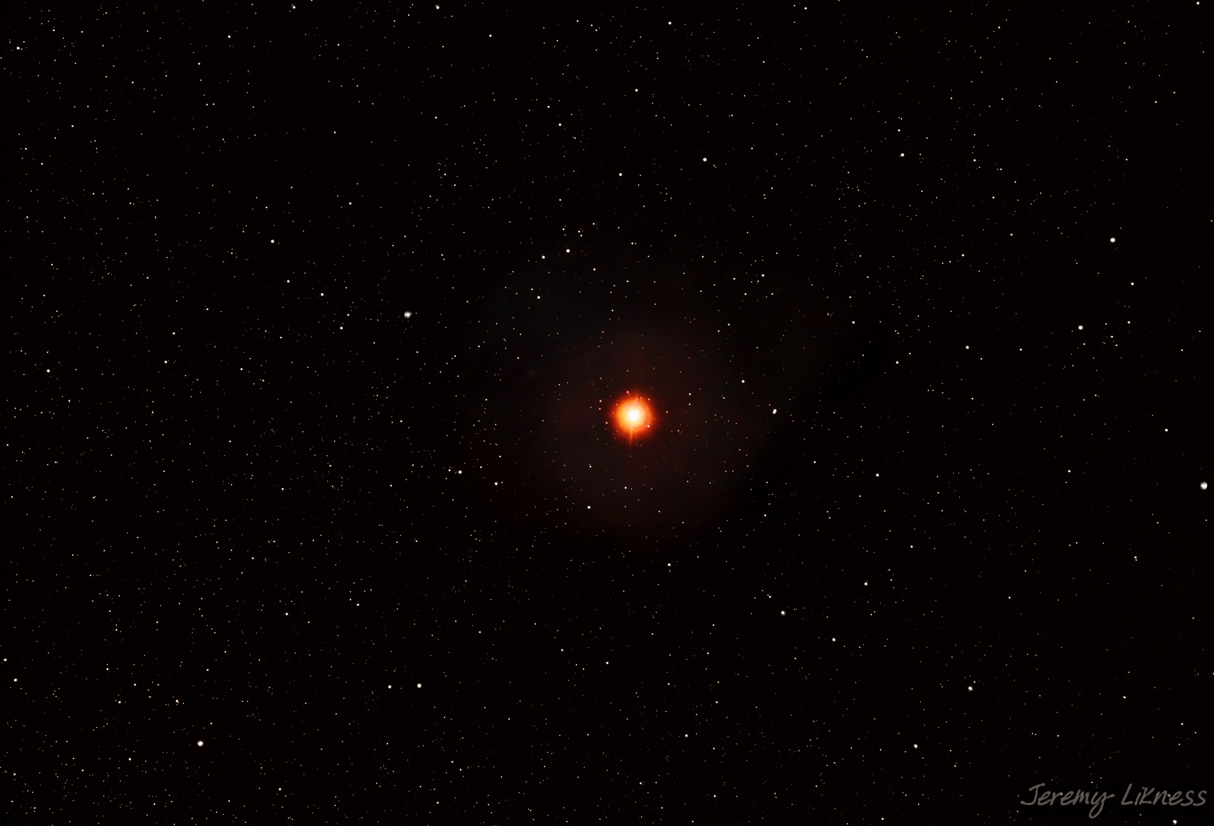 This massive beacon in the night sky on Orion's 'shoulder' is a red supergiant with a mass 10 - 20 times that of our own sun. For comparison, if you exchanged the sun for Betelgeuse, the latter would swallow everything from Mercury through Mars to the asteroid belt. Most astronomers agree it is close to supernova +/- 100,000 years.