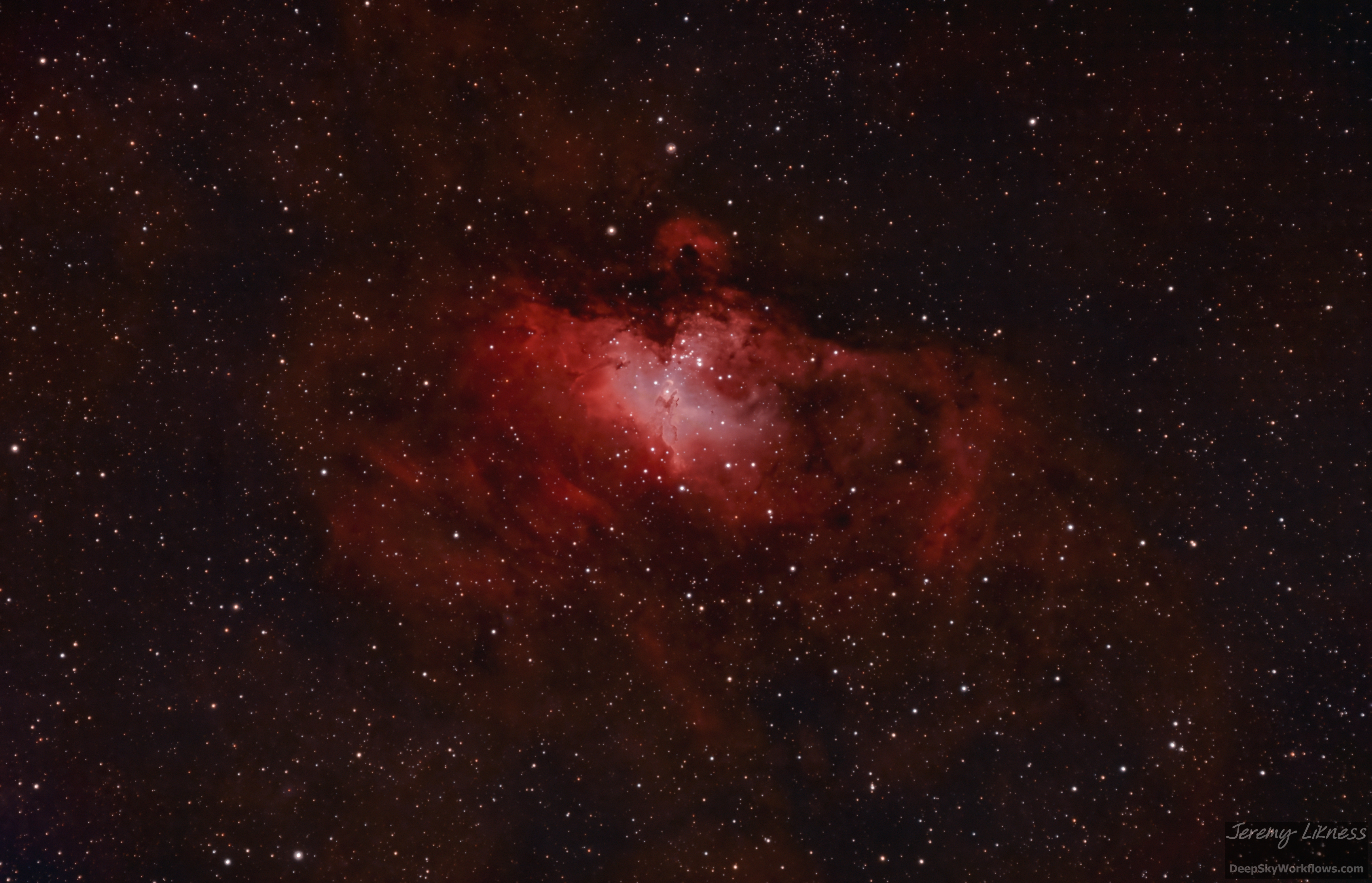 The Eagle a.k.a. the Star Queen nebula, M16, with the Pillars of Creation at its heart. 2.5 hours of 5-minute exposures on an Svbony sv503 70ED with a ZWO ASI294MC Pro camera and the Optolong l-eXtreme filter in Monroe's Bortle 6 skies.