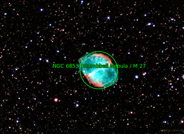 This bright nebula visible in binoculars is a planetary nebula surrounding a white dwarf star.