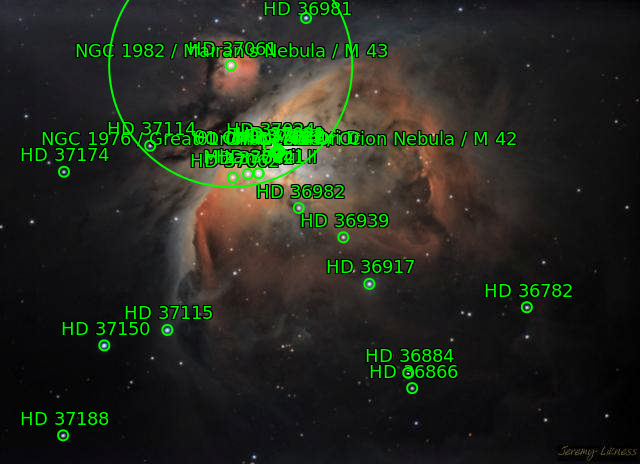 41 Ori A 41 Ori C 41 Ori D 43 Ori Great Orion Nebula M42 M43 Mairan's Nebula NGC1976 NGC1982 Orion Nebula The star Mizan Batil II (θ2 Ori) The star Trapezium (θ1 Ori A) The star θ1 Ori C The star θ1 Ori D