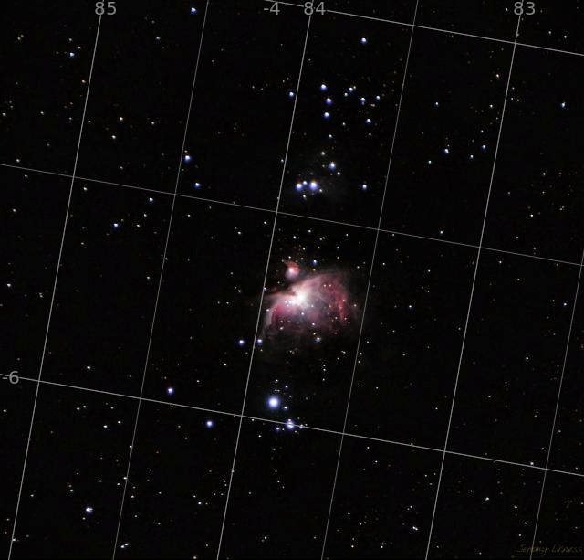 The star ιOri NGC1976 M42 The star θ1Ori The star θ2Ori NGC1982 M43 The star 42Ori NGC1973 NGC1981 NGC1975 NGC1980 NGC1977 The star 45Ori Great Orion Nebula Orion Nebula the Running Man Nebula Lower Sword Mairan's Nebula IC420 Upper Sword