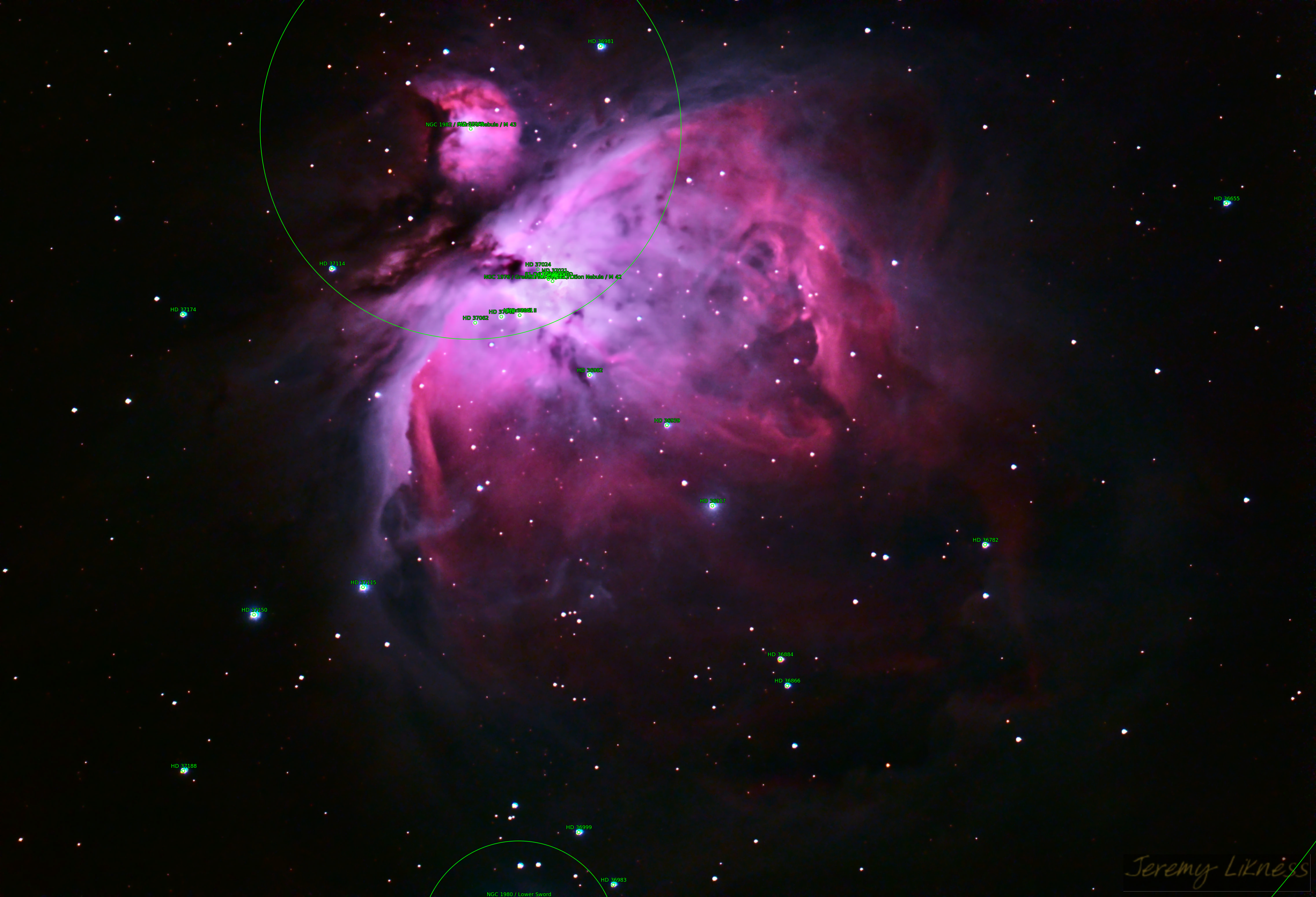 NGC1976 M42 The star θ1Ori The star θ2Ori NGC1982 M43 Great Orion Nebula Orion Nebula Mairan's Nebula