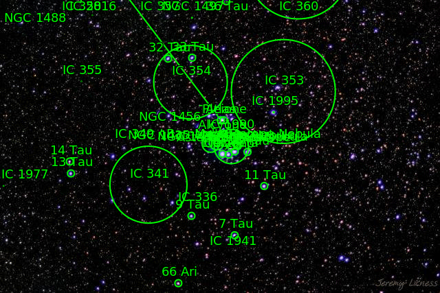 19 Tau 25 Tau Barnard's Merope Nebula IC341 IC349 IC353 IC354 Maia Nebula Merope Nebula NGC1432 NGC1435 The star 18 Tau The star 32 Tau The star 36 Tau The star Alcyone (η Tau) The star Atlas (27 Tau) The star Celaeno (16 Tau) The star Electra (17 Tau) The star Merope (23 Tau) The star Pleione (28 Tau) The star Taygeta (q Tau)