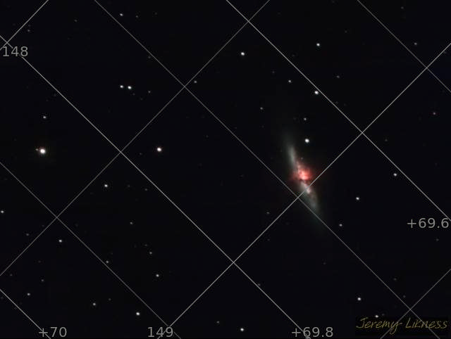 'Come on here, dear boy, have a cigar...' a Cigar Galaxy, that is. M82 is in close proximity to M81 (Bode's Galaxy) and it's believed that gravitational interactions between the two created what is known as a 'starburst' that can be easily seen in the middle.