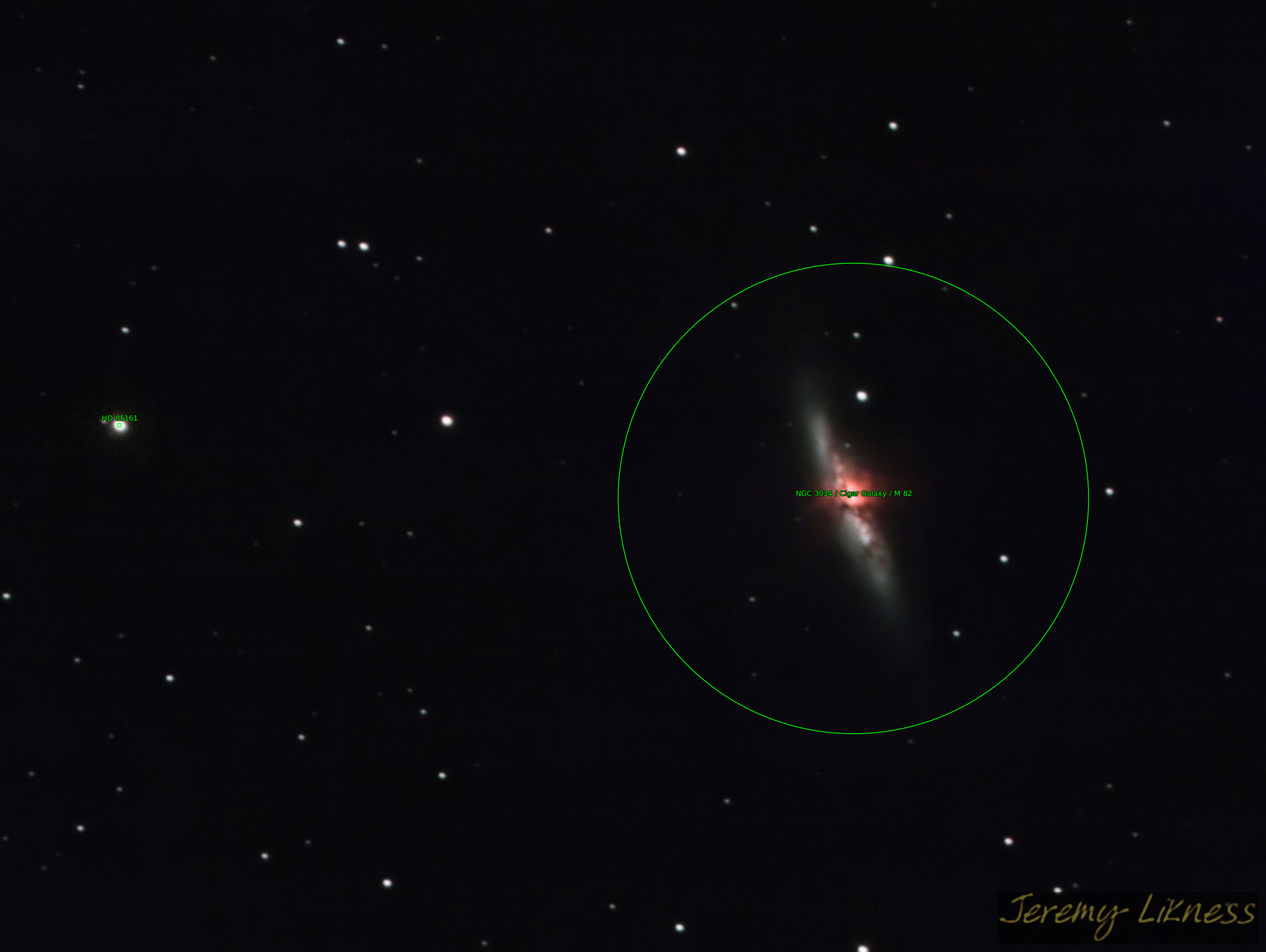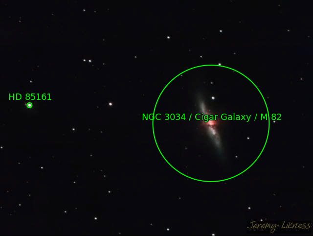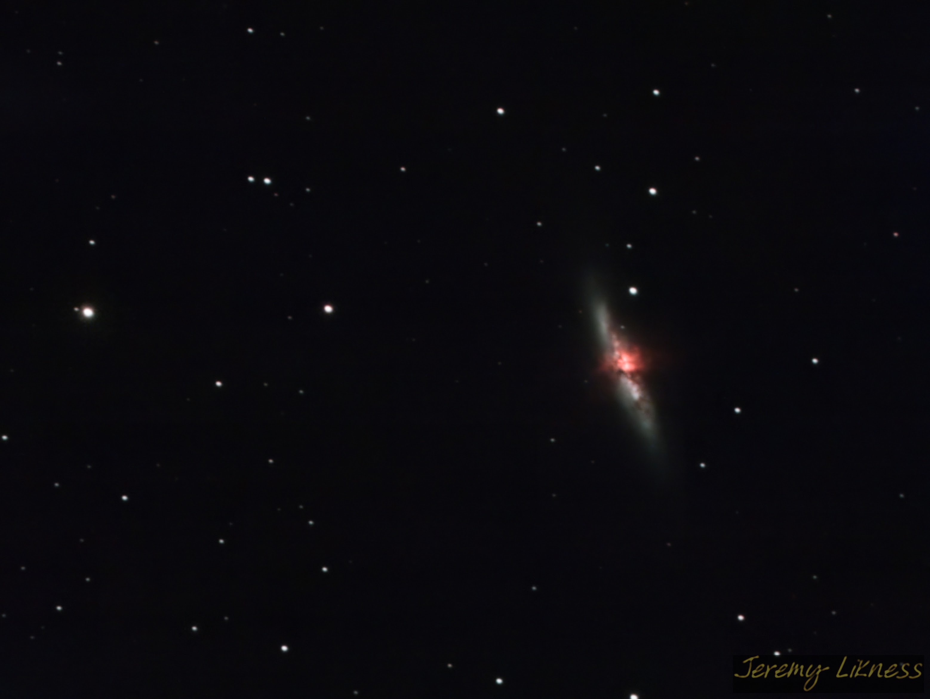 'Come on here, dear boy, have a cigar...' a Cigar Galaxy, that is. M82 is in close proximity to M81 (Bode's Galaxy) and it's believed that gravitational interactions between the two created what is known as a 'starburst' that can be easily seen in the middle.