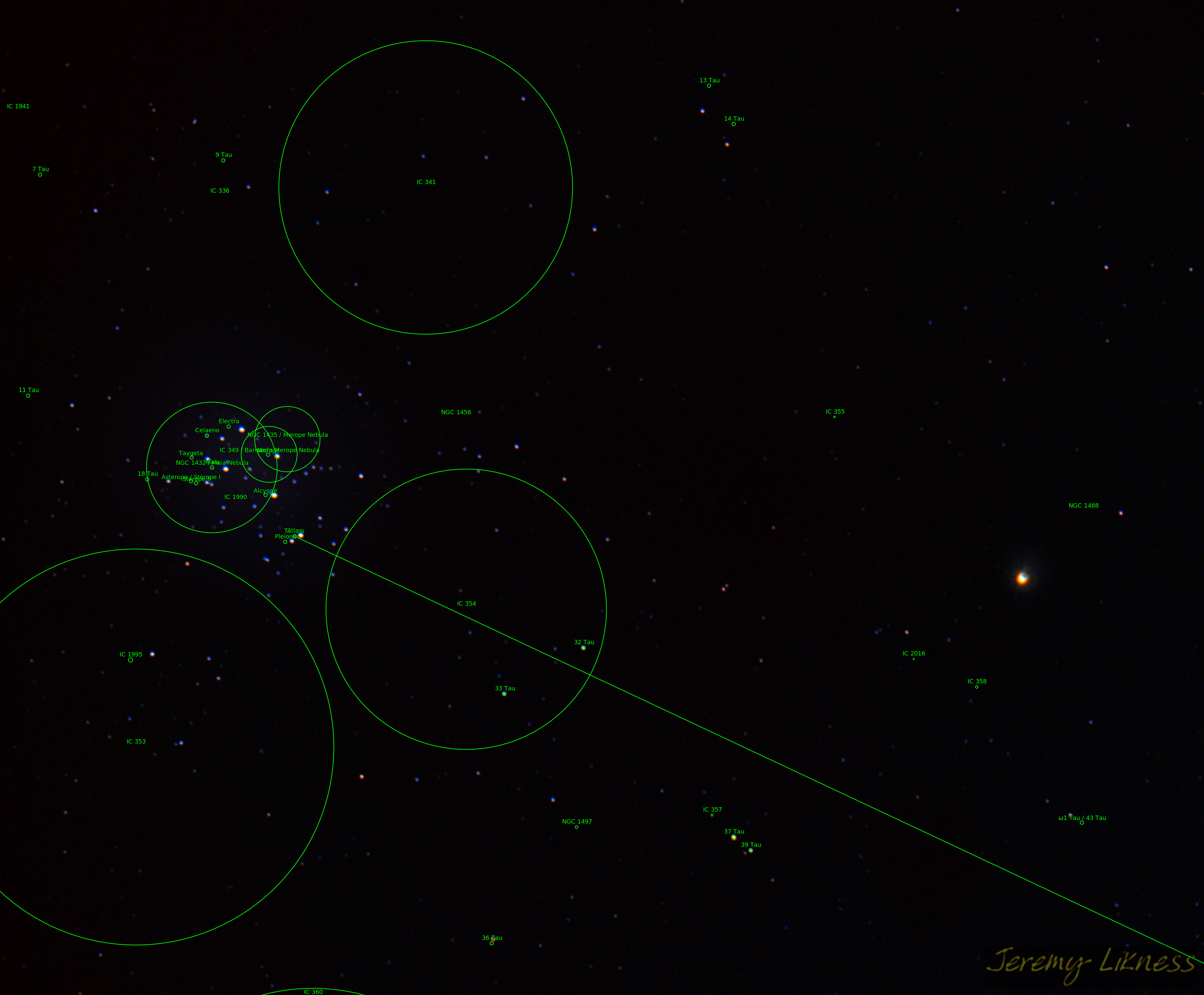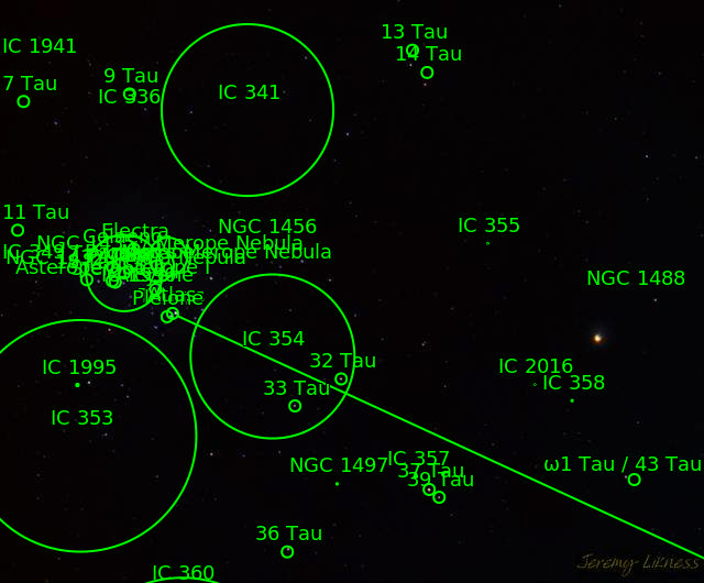 19 Tau 25 Tau 43 Tau Barnard's Merope Nebula IC341 IC349 IC353 IC354 Maia Nebula Merope Nebula NGC1432 NGC1435 The star 36 Tau The star 37 Tau The star Alcyone (η Tau) The star Atlas (27 Tau) The star Celaeno (16 Tau) The star Electra (17 Tau) The star Merope (23 Tau) The star Pleione (28 Tau) The star Taygeta (q Tau) The star ω1 Tau