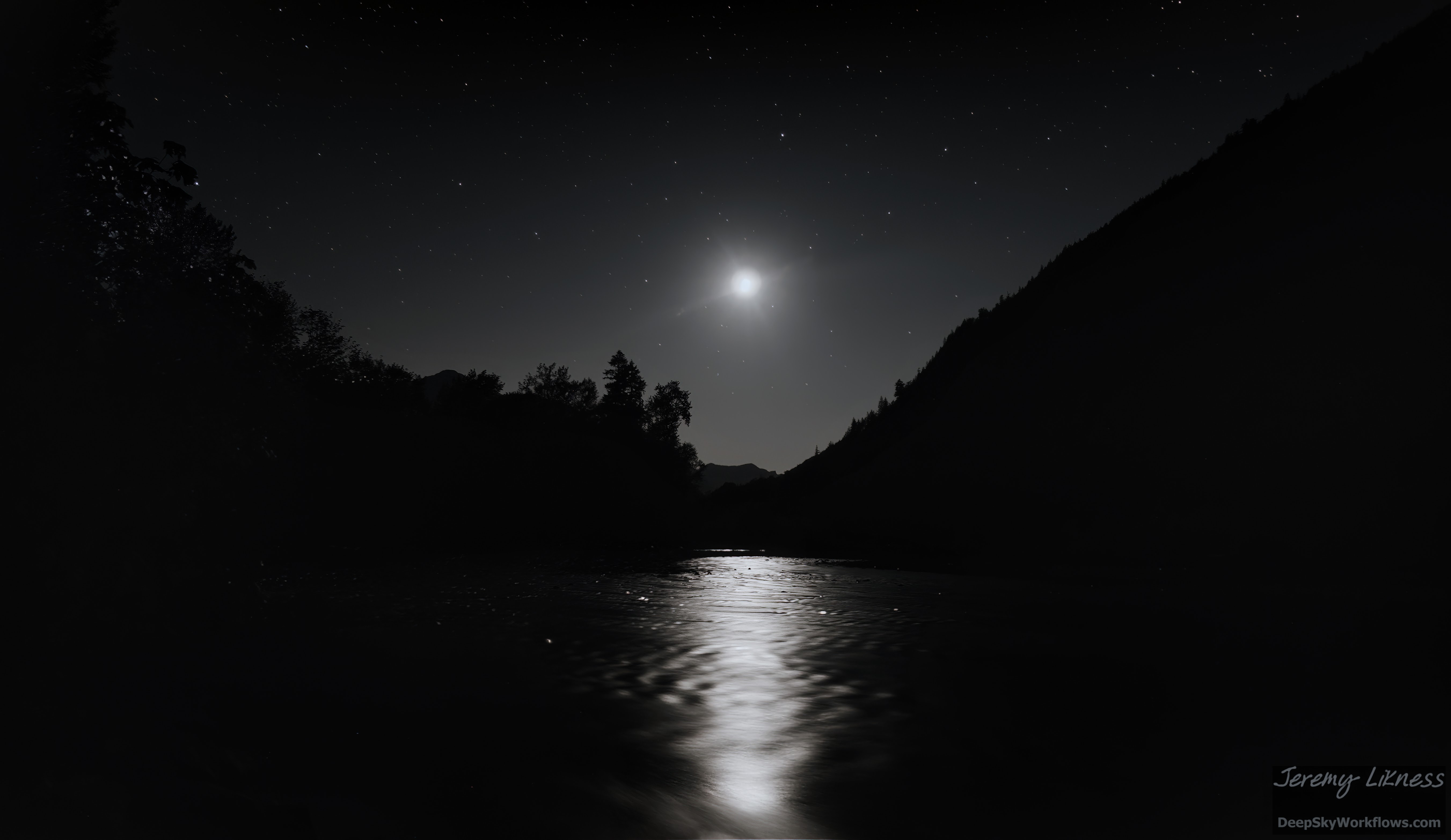 The moon was reflected in the waters of the river, so I snapped this photograph without realizing it also captured the reflection of stars in water.