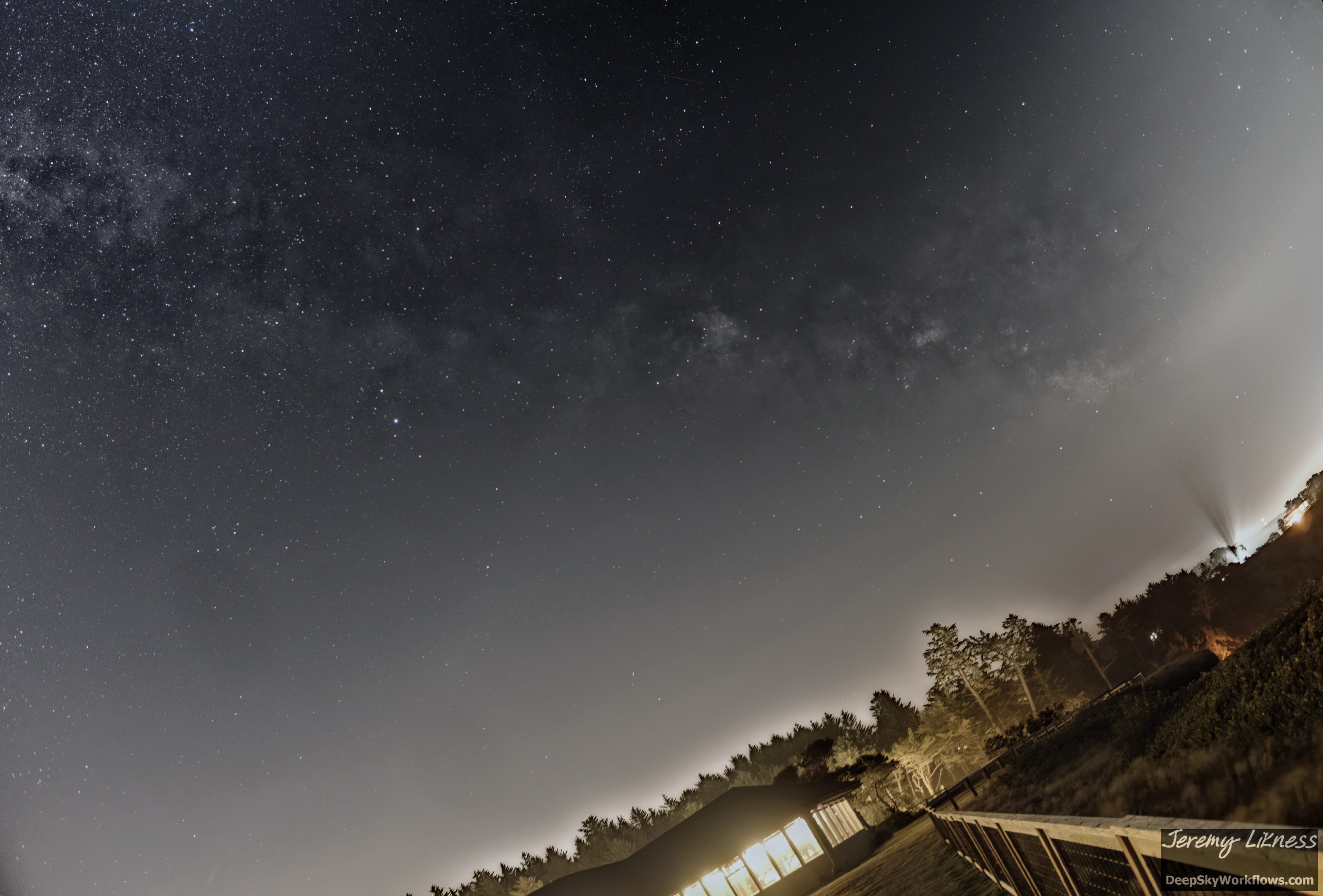 The arch of the Milky Way began to descend as I swung my camera south. The horizon was already brightening from the moon. The glow to the south is the town of Newport. Taken from Cape Foulweather.