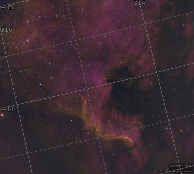 Shakedown for first light with new rig. Limited window of sky at my location meant short time on each target. Spent less than one hour exposure each on bright nebulae, a cluster and a galaxy. Minimal processing but I'm excited for the potential. First target was the North America Nebula. Rig: William Optics Redcat 71 (338mm f/5), ZWO ASI294MM Pro (monochrome), ZWO 8-filter wheel (used 7: LRGBSHO). 160mm Orion guide scope with ZWO ASI290MM Mini. All on a ZWO AM5 (no need for a counterweight!) mount.
