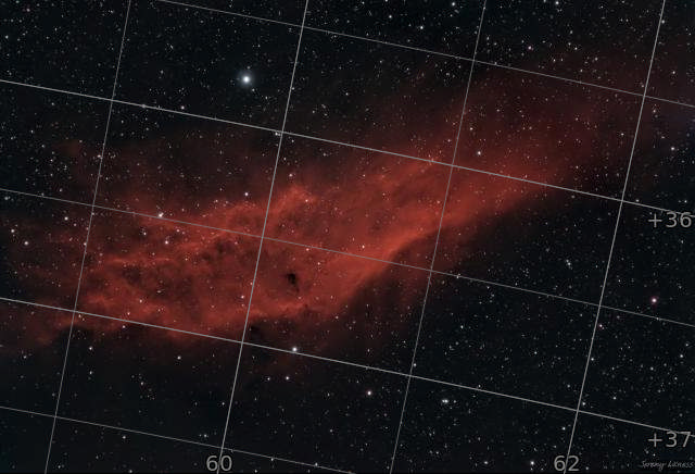 WLike a billowing blanket let down across the sky, this textured red streak is NGC1499, the California Nebula. It sprawls across 2.5 degrees of sky due east of M45.