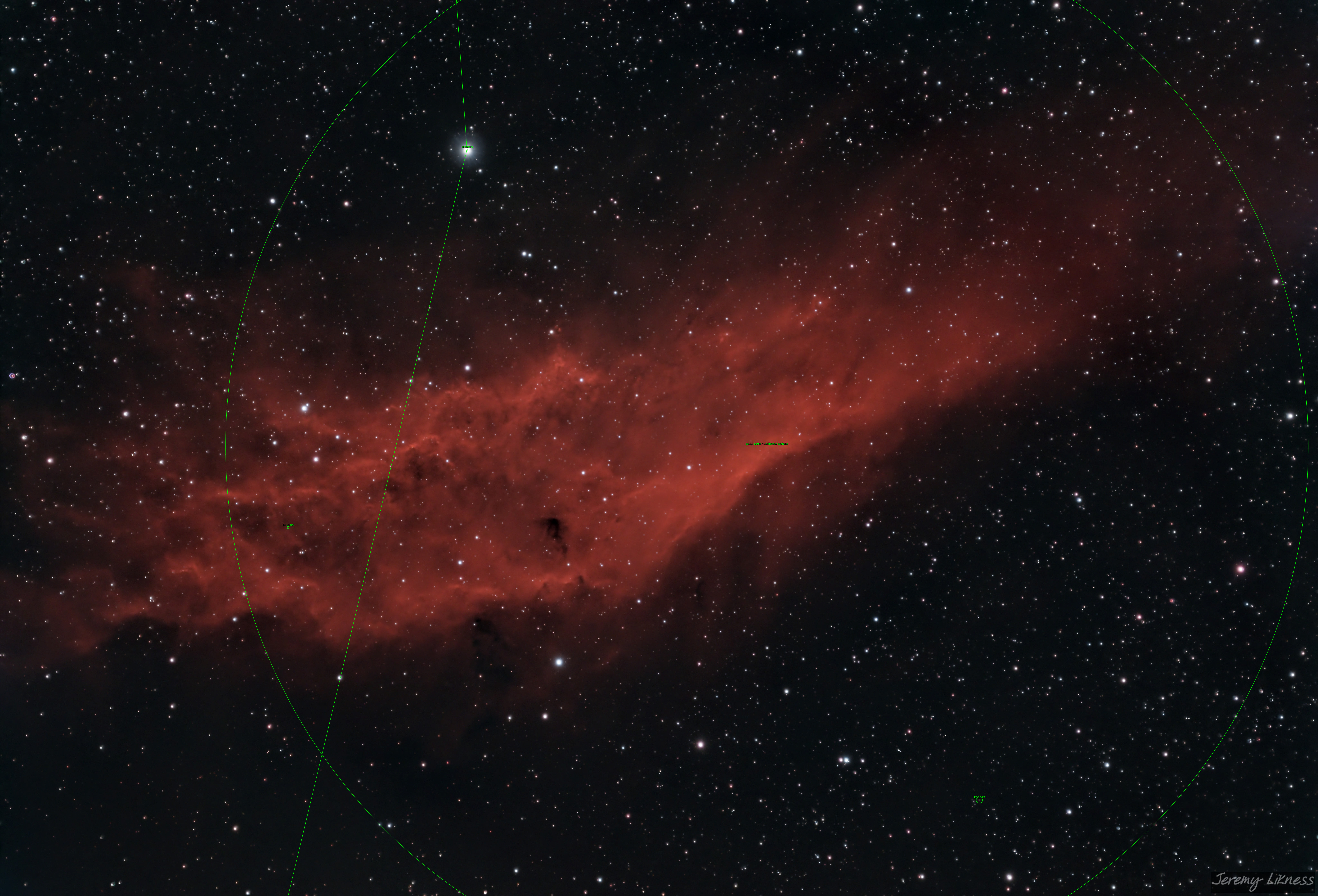 WLike a billowing blanket let down across the sky, this textured red streak is NGC1499, the California Nebula. It sprawls across 2.5 degrees of sky due east of M45.