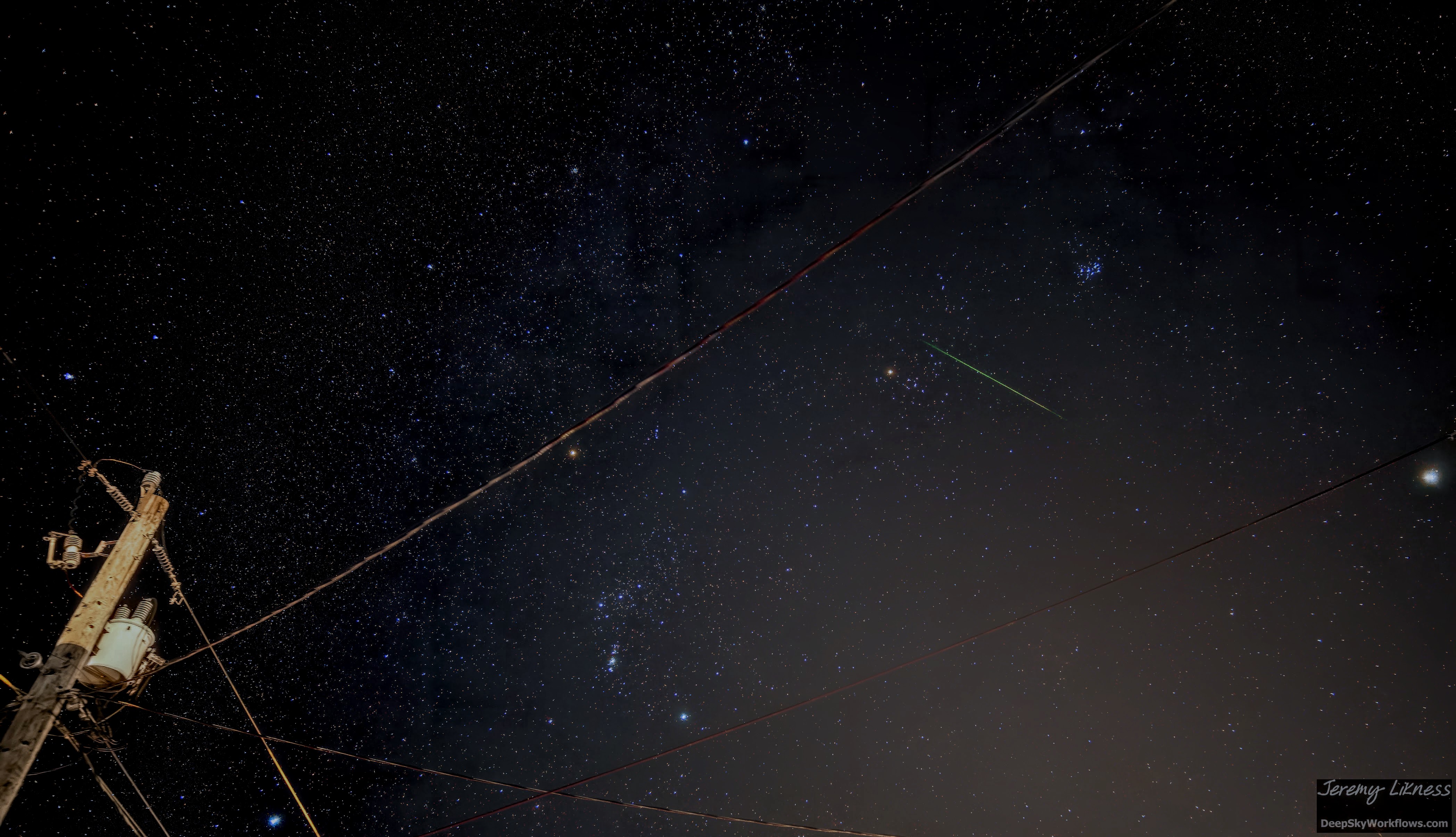I set out my camera and programmed it for 25-second exposures to run all night long. I love to see videos made from timelapses like this, but I also was in search of a meteor. The Leonids are reaching their peak and indeed I captured one oriented in the direction of faraway constellation Leo. I believe the green indicates a good amount of magnesium, or maybe it's just chromatic aberration. The meteor chose a terrific frame to appear in. Orion fits perfectly between the two power lines. Aldebaran blazes brightly just below the green streak of metals burning in the atmosphere. The meteor is a Leonid, as an imaginary line drawn through it would terminate near the constellation Leo. As a bonus, the bright white object just about to exit the stage right is none other than Jupiter.