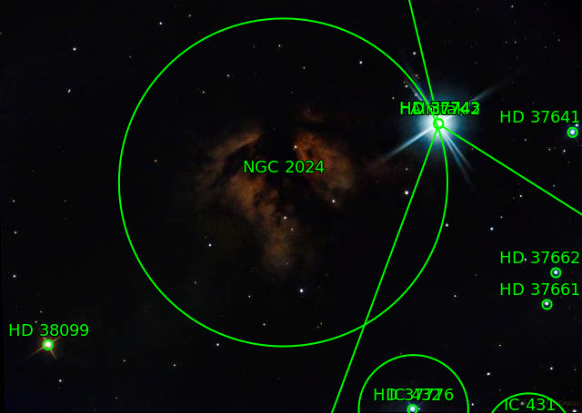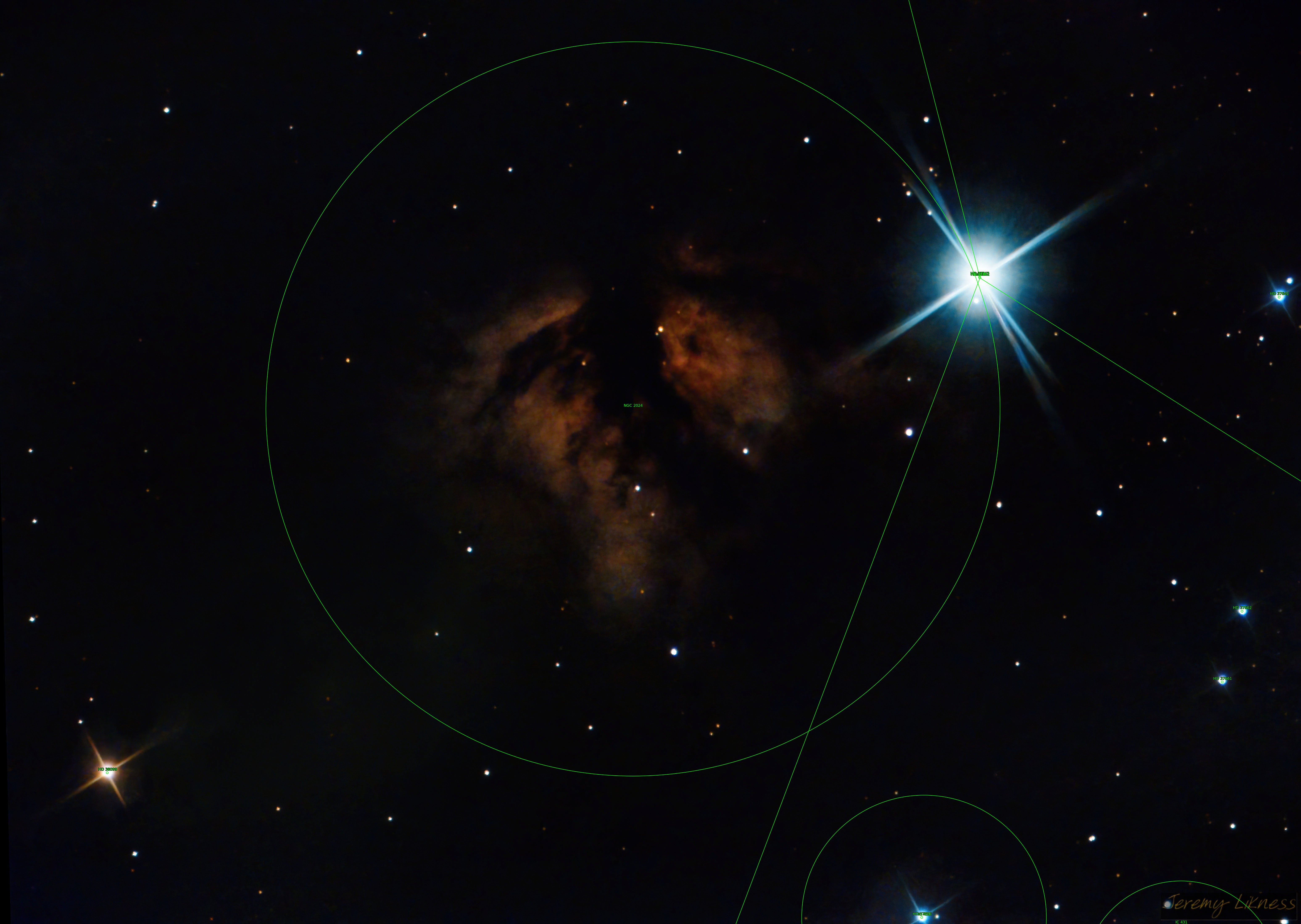 The star ζ Orionis (Alnitak) is the leftmost star on the constellation Orion's belt. It is a triple star system hosted by a blue supergiant. Next to it bursts the Flame Nebula, an emission nebular supercharged by ultraviolet rays emanating from Alnitak. Often grouped with the more iconic Horsehead Nebula (IC434), the Flame stands well on its own.