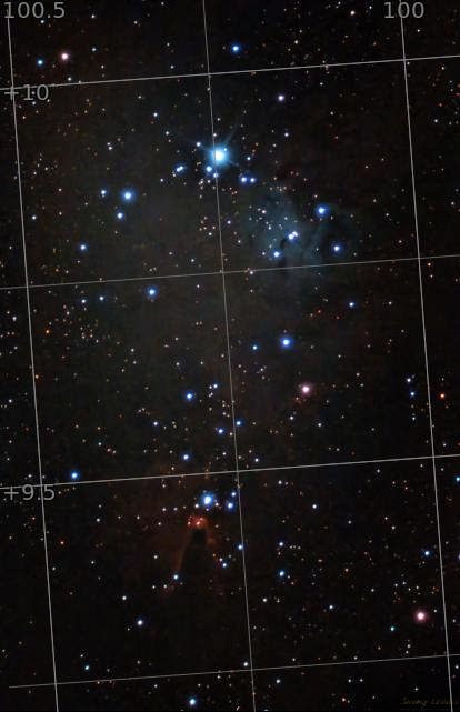 This dense patch of stars and nebulae hosts a variety of targets. Starting at the bottom is the Cone Nebula. The top of the cone touches the inserted peak of the Christmas Tree Cluster. Past the faintly visible Snowflake Nebula is the bluish Fox Fur Nebula.