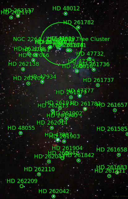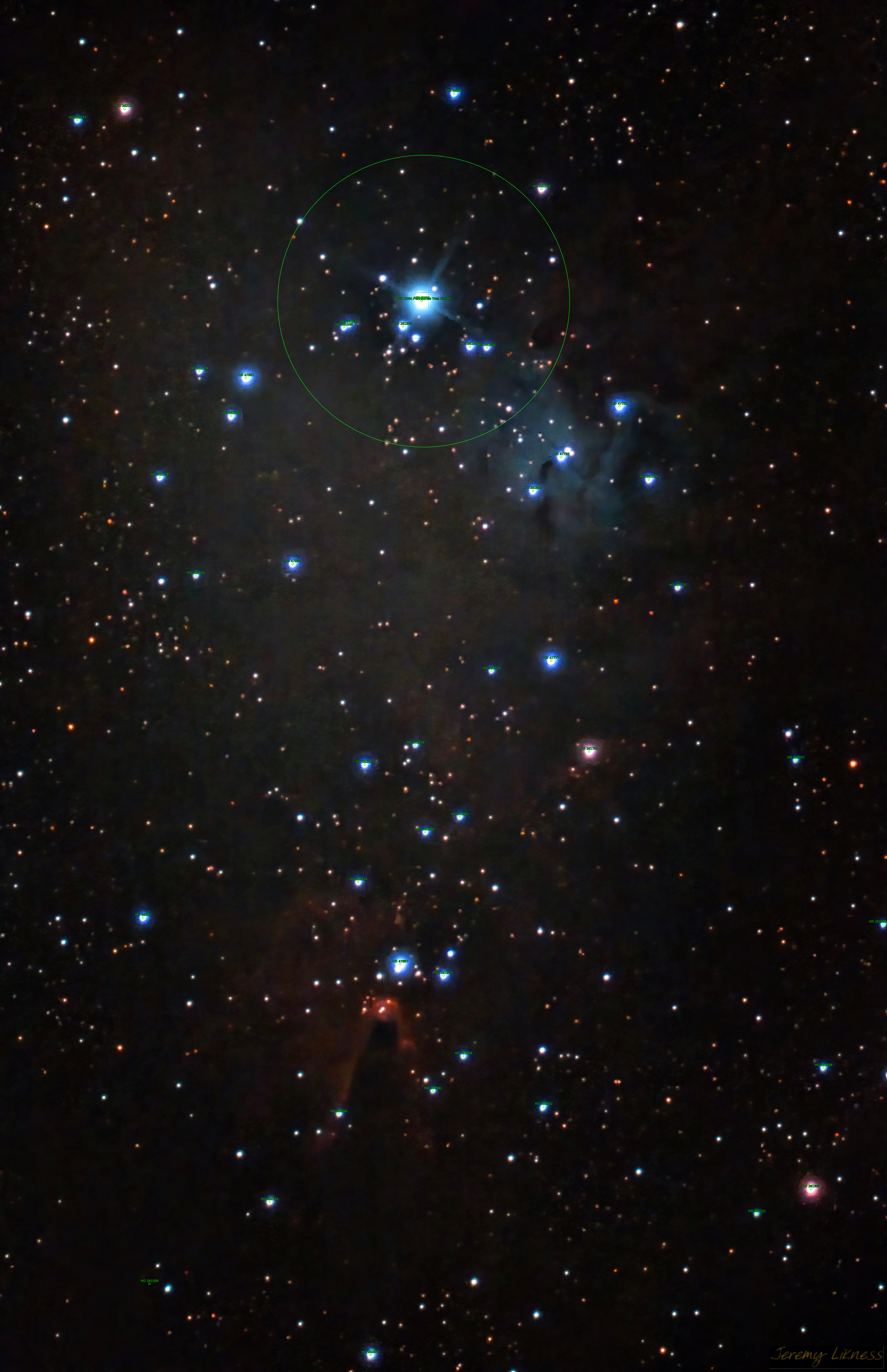 This dense patch of stars and nebulae hosts a variety of targets. Starting at the bottom is the Cone Nebula. The top of the cone touches the inserted peak of the Christmas Tree Cluster. Past the faintly visible Snowflake Nebula is the bluish Fox Fur Nebula.