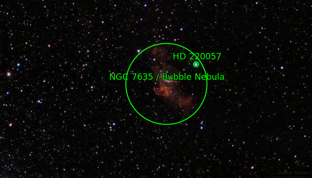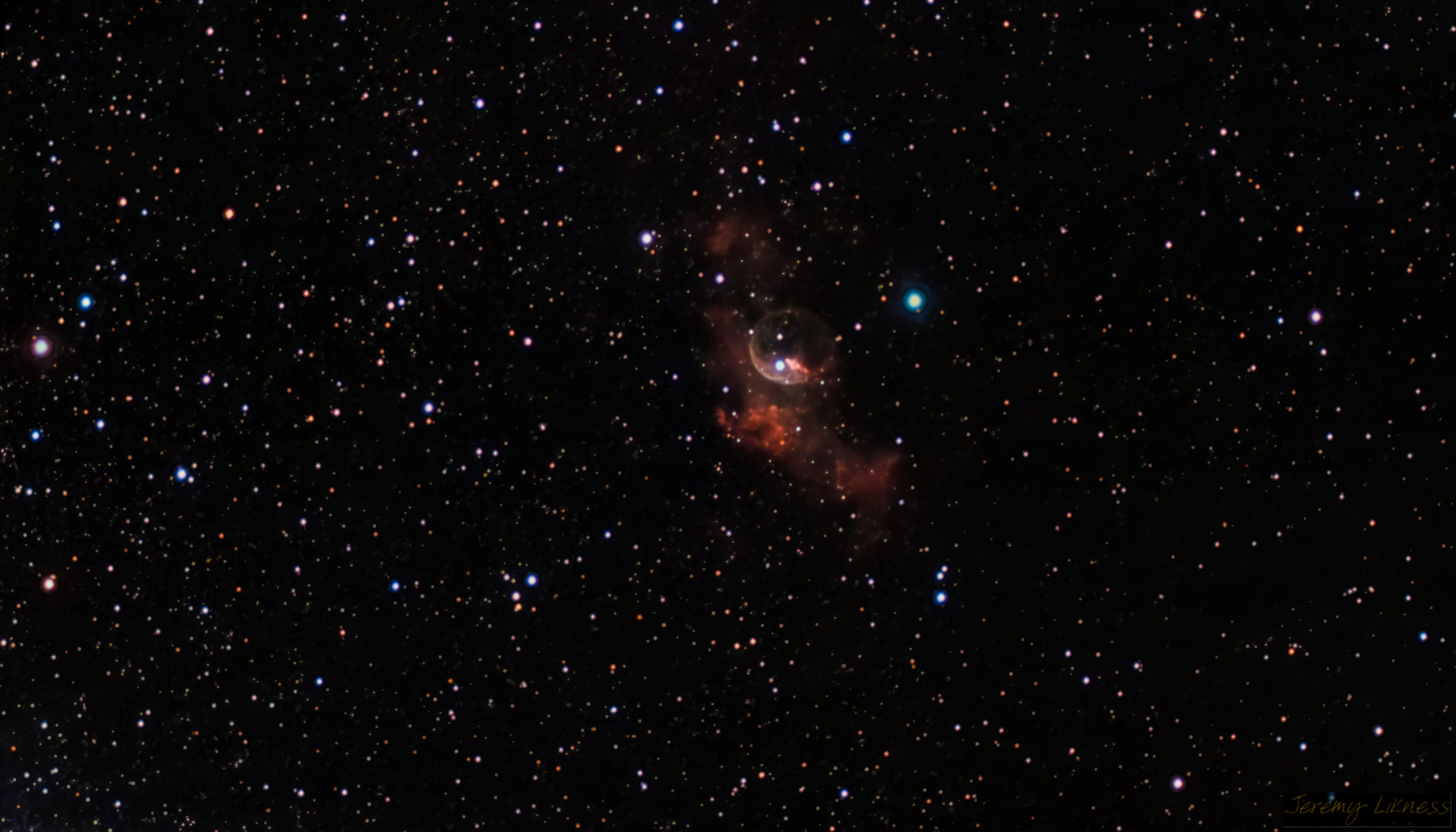 The bubble is a cloud of molecular gas blown outward by an energetic young star and supercharged so it glows.