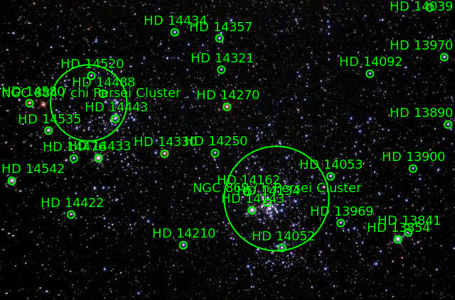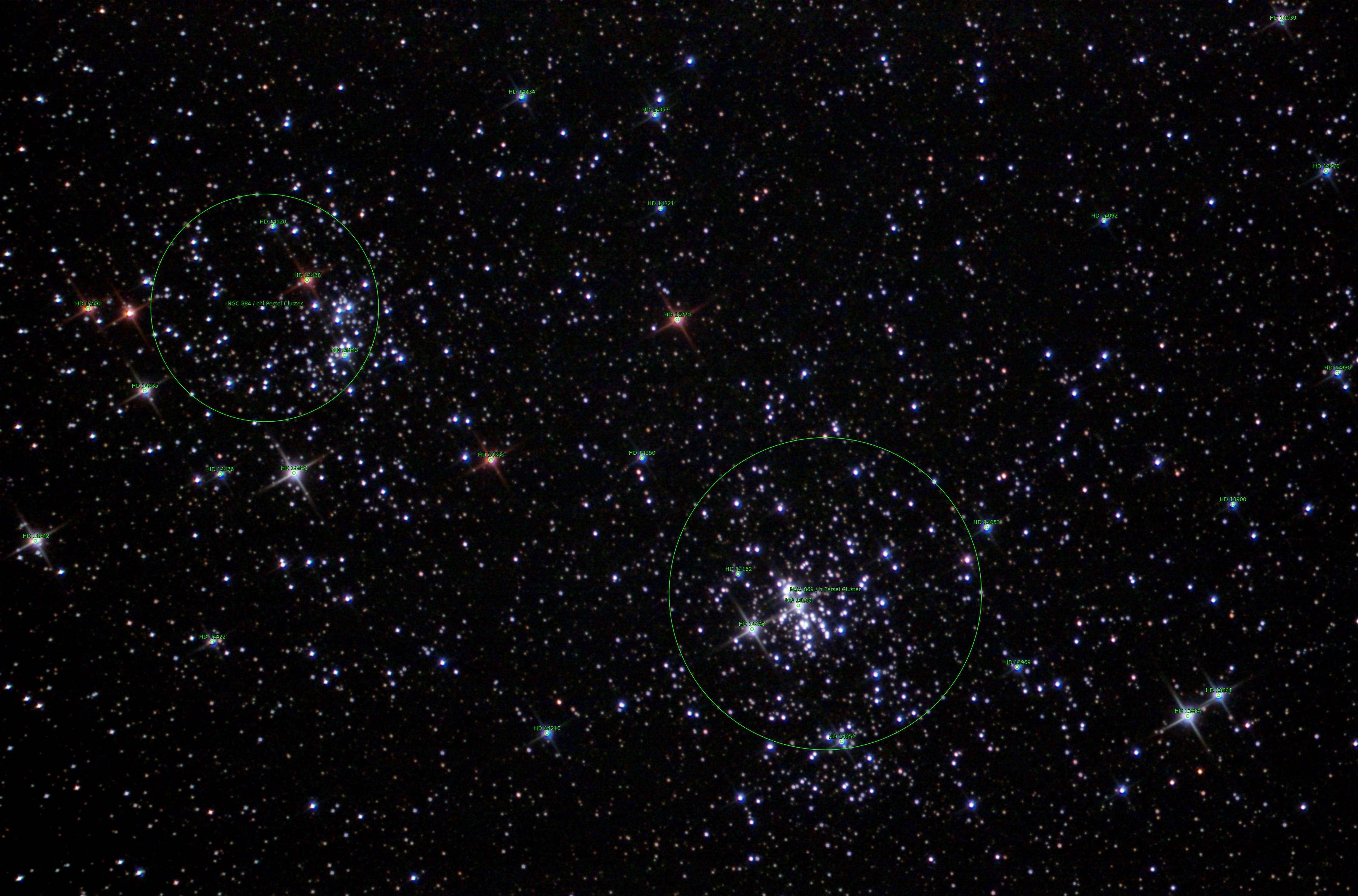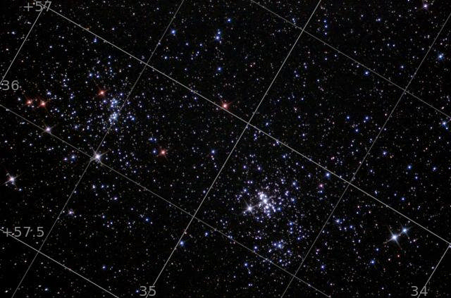 A bright and colorful grouping of two clusters that span a section of the sky twice the size of a full moon.