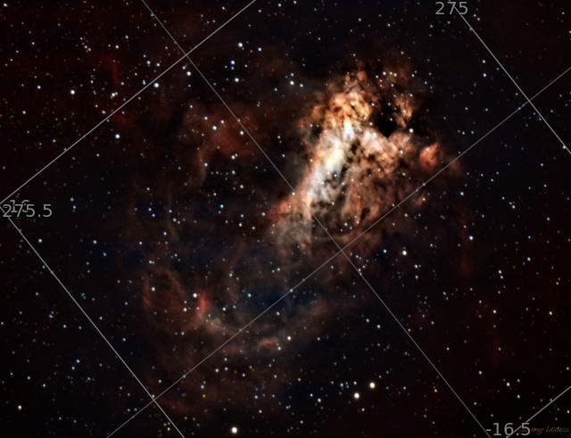 M17 goes by several different names: Checkmark, Horseshoe, Lobster, Omega and Swan. It is a massive star-forming region that is bright and richly structured. It has a complex structure that is unique due to the almost straight-edged regions of darks and transitions from billowing clouds of molecular gas to long, twisting tendrils.