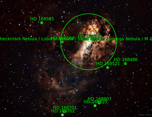 M17 goes by several different names: Checkmark, Horseshoe, Lobster, Omega and Swan. It is a massive star-forming region that is bright and richly structured. It has a complex structure that is unique due to the almost straight-edged regions of darks and transitions from billowing clouds of molecular gas to long, twisting tendrils.