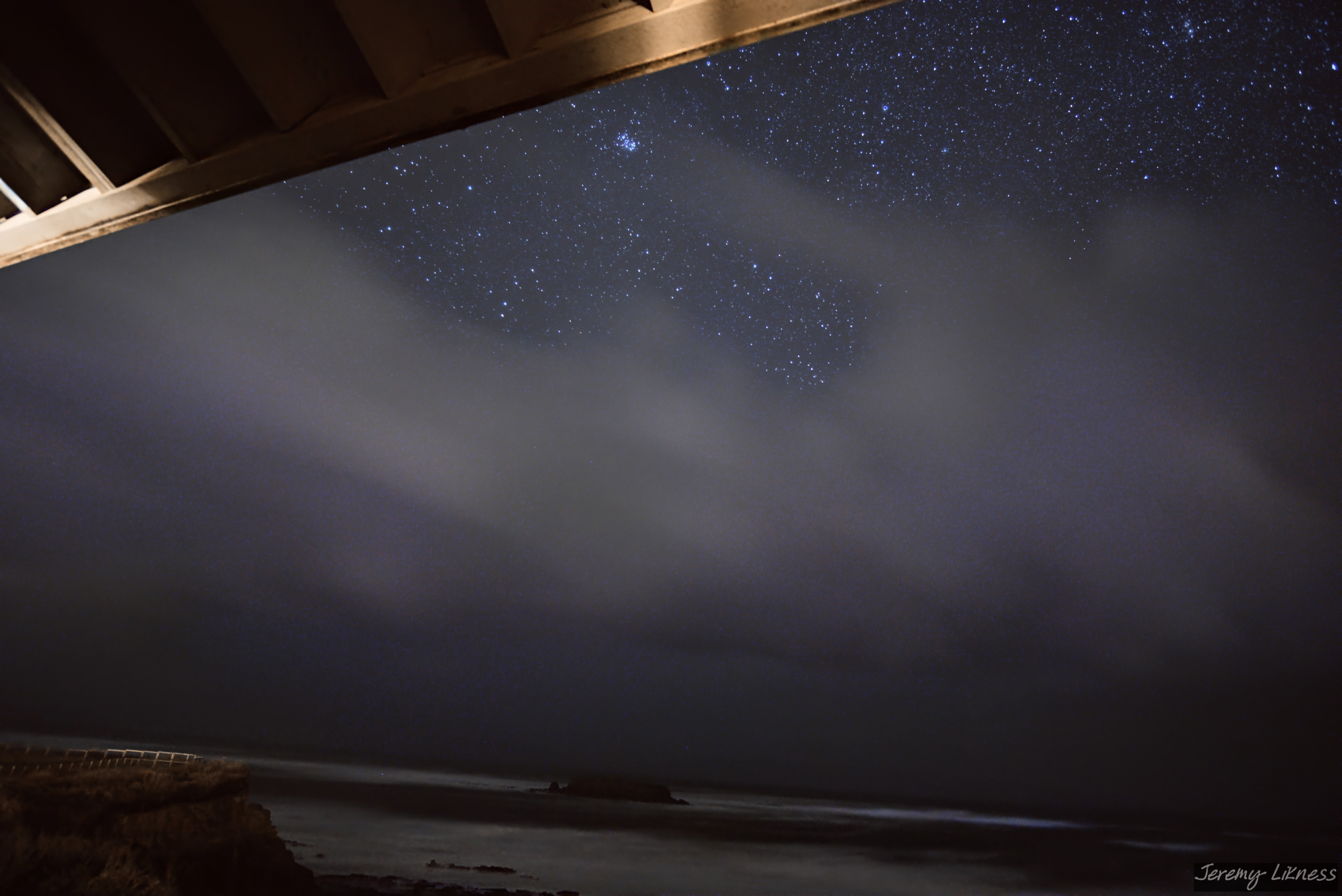 The Seven Sisters were a barely visible bright patch of light I could just make out with my peripheral vision. A long camera exposure revealed M45: the Pleiades visible over the edge of a storm hovering directly over Gull Rock.