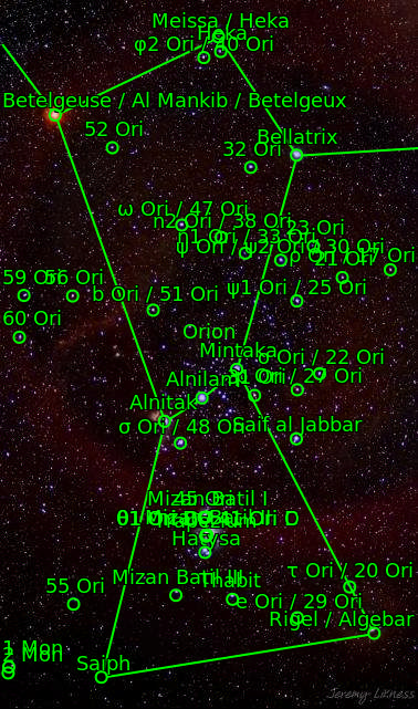 19 Ori 24 Ori 28 Ori 34 Ori 39 Ori 44 Ori 46 Ori 50 Ori 53 Ori 58 Ori Al Mankib Algebar (β Ori) Betelgeux (α Ori) Flame Nebula Great Orion Nebula Heka (λ Ori) IC434 M42 M43 Mairan's Nebula NGC1976 NGC1982 NGC2024 NGC2112 Orion B Orion Nebula Part of the constellation Orion (Ori) The star Alnilam (ε Ori) The star Alnitak (ζ Ori) The star Bellatrix (γ Ori) The star Betelgeuse The star Hatysa (ι Ori) The star Meissa The star Mintaka (δ Ori) The star Rigel The star Saif al Jabbar (η Ori) The star Saiph (κ Ori)