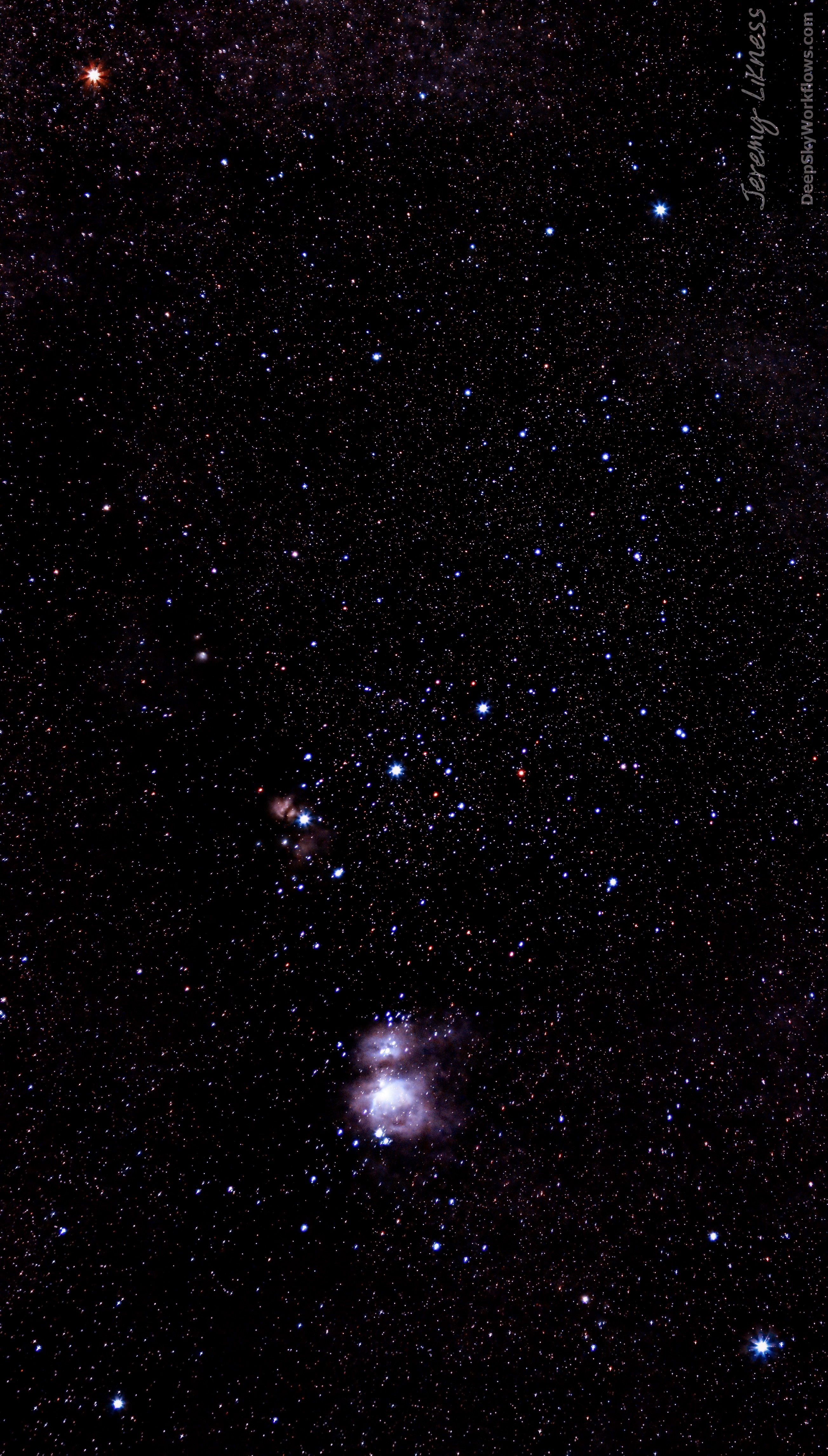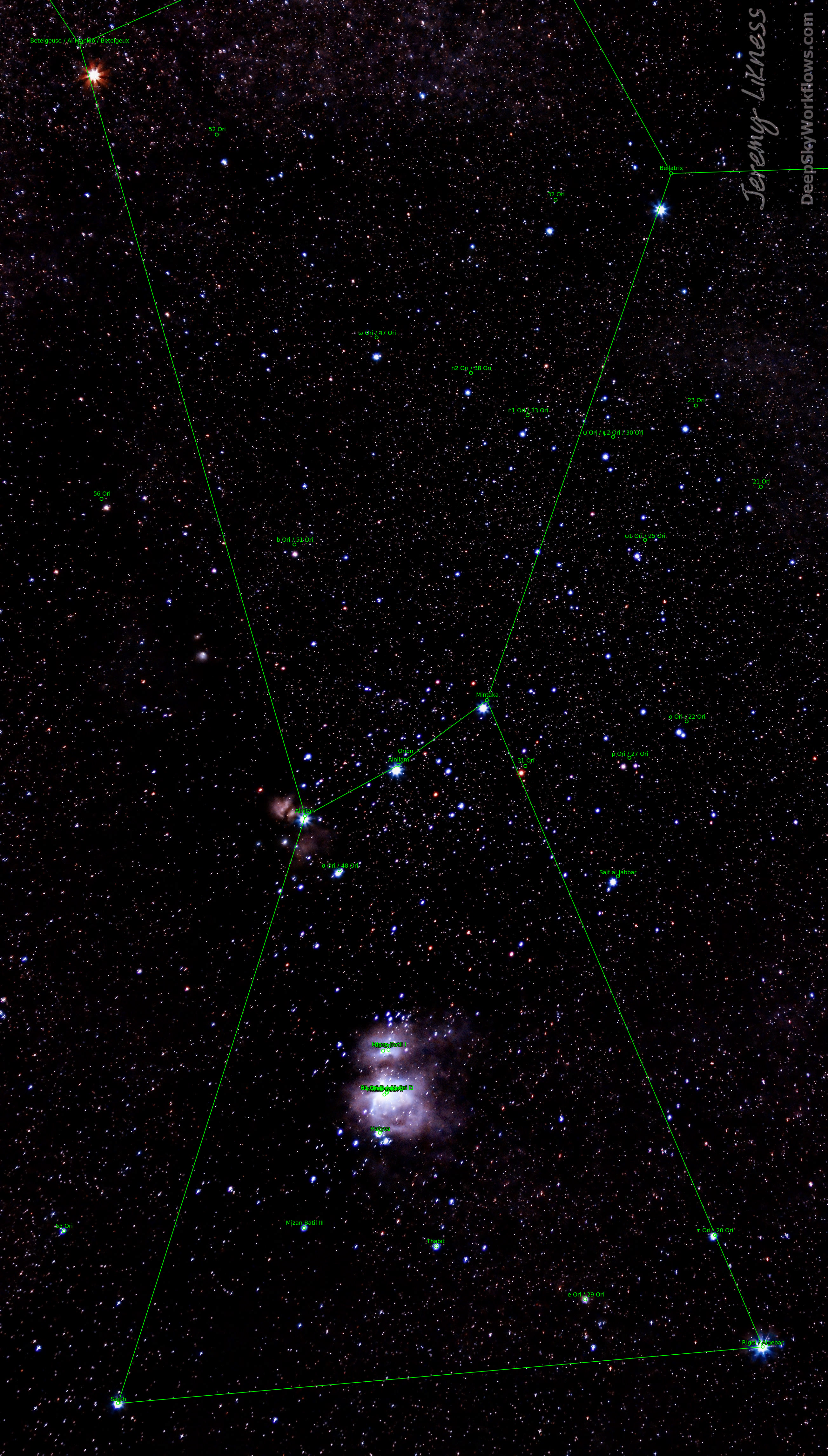 Part of the constellation Orion (Ori) The star Rigel Algebar (β Ori) 19 Ori The star Betelgeuse Al Mankib Betelgeux (α Ori) 58 Ori The star Bellatrix (γ Ori) 24 Ori The star Alnilam (ε Ori) 46 Ori The star Alnitak (ζ Ori) 50 Ori The star Saiph (κ Ori) 53 Ori The star Mintaka (δ Ori) 34 Ori The star Hatysa (ι Ori) 44 Ori The star Saif al Jabbar (η Ori) 28 Ori The star τ Ori 20 Ori IC434 Flame Nebula Orion B NGC1976 Great Orion Nebula Orion Nebula M42 NGC1982 Mairans Nebula M43 NGC2024 NGC2112