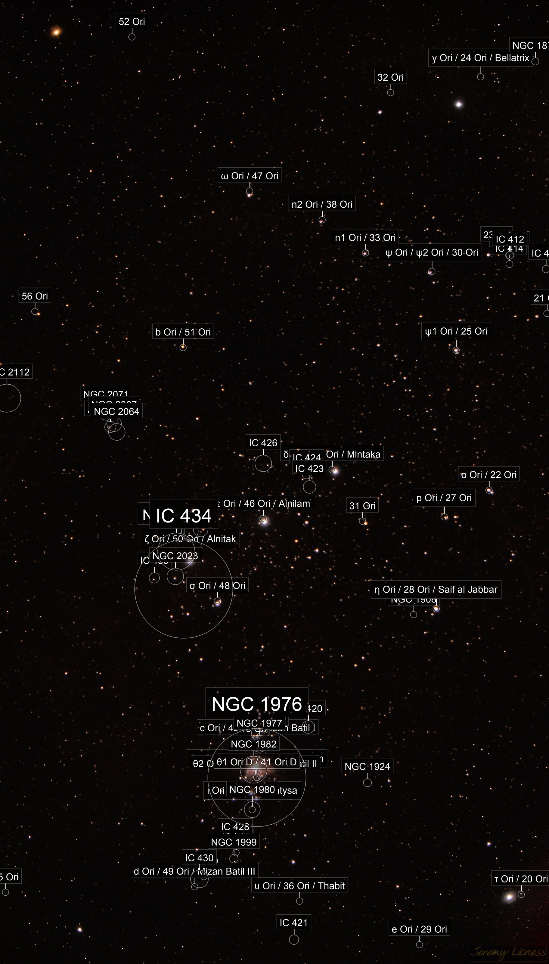 Part of the constellation Orion (Ori) The star Betelgeuse (αOri) Betelgeuse The star Bellatrix (γOri) Bellatrix The star Alnilam (εOri) The star Alnitak (ζOri) The star Mintaka (δOri) The star ιOri NGC1976 M42 IC434 NGC2024 NGC1982 M43 The star σOri The star ηOri The star 32Ori NGC2112 Great Orion Nebula Orion Nebula Mairan's Nebula Flame Nebula Orion B