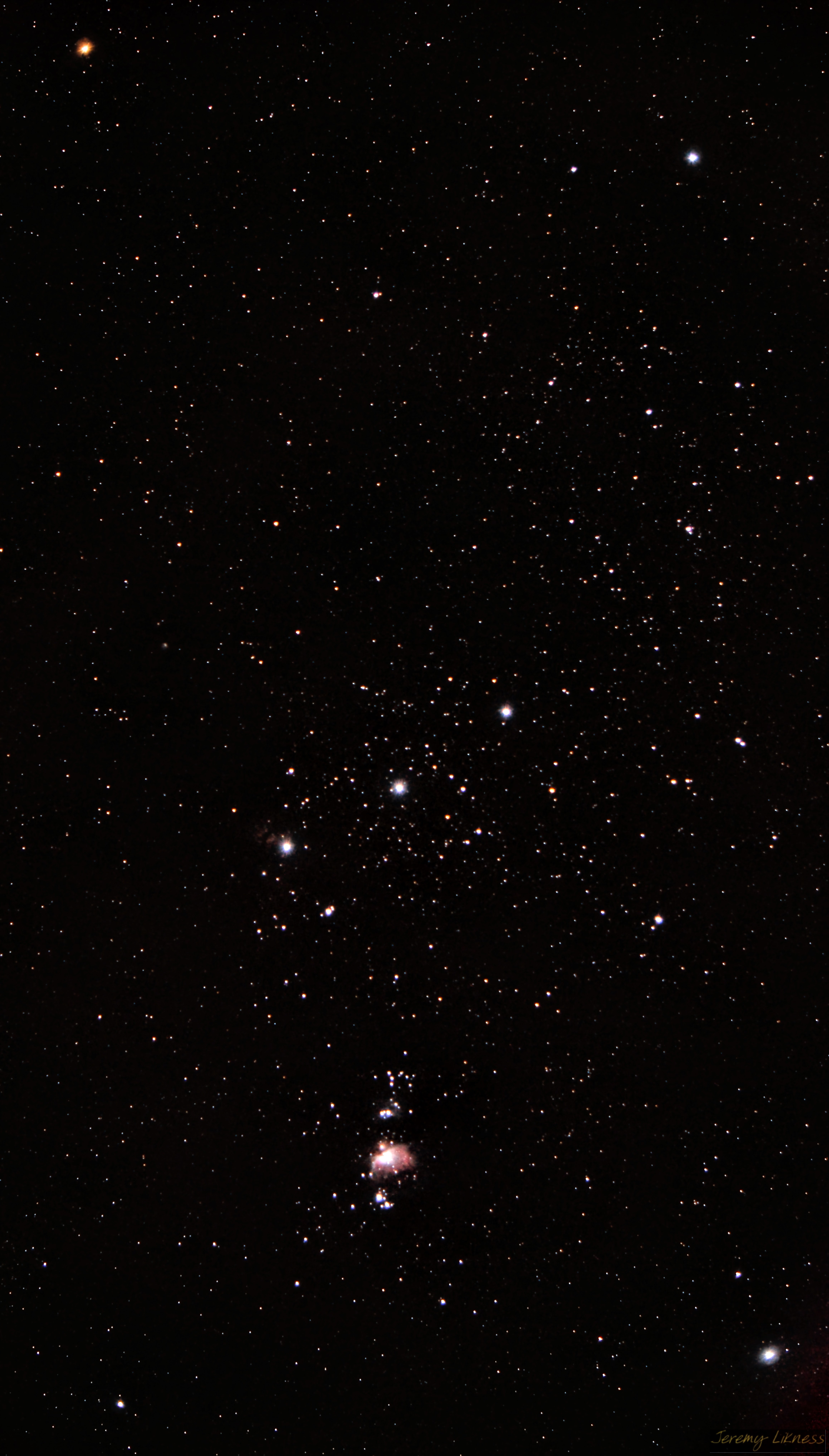This detailed photograph of the Orion constellation is rich nebulae. The Flame Nebula is on the left of the 'belt' and the Orion Nebula pops at the bottom of the 'sword'.