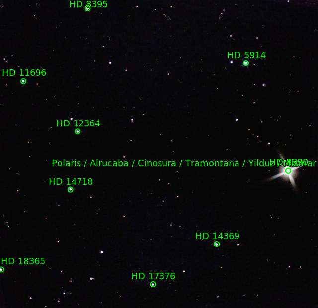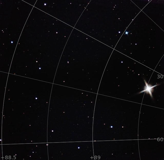 Polaris, the North Star, makes the crowning jewel on a ring of several neighboring stars in this mosaic.