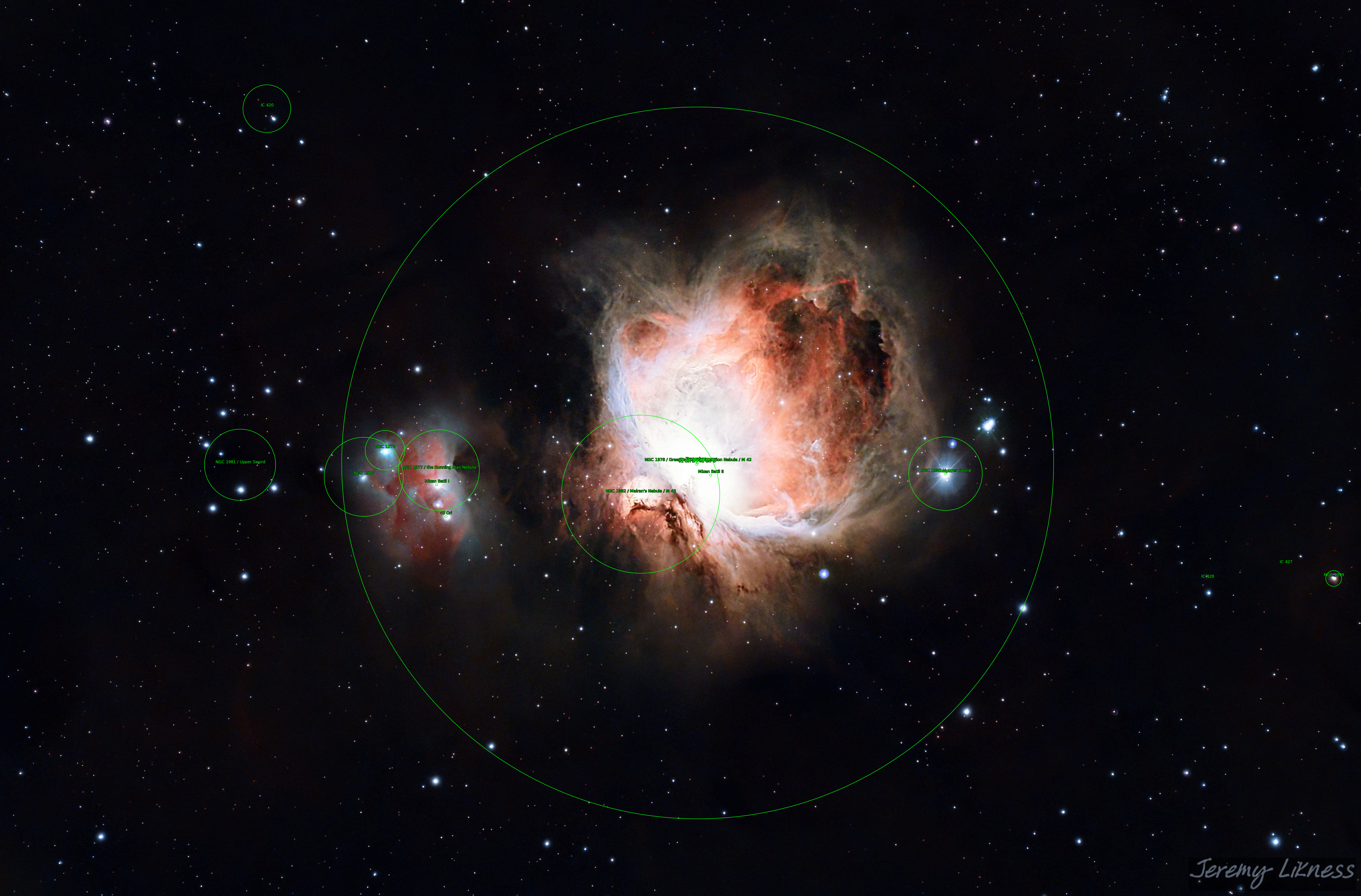41 Ori A 41 Ori C 41 Ori D 42 Ori 43 Ori 44 Ori Great Orion Nebula IC420 Lower Sword M42 M43 Mairan's Nebula NGC1973 NGC1975 NGC1976 NGC1977 NGC1980 NGC1981 NGC1982 Orion Nebula The star 45 Ori The star Hatysa (ι Ori) The star Mizan Batil I (c Ori) The star Mizan Batil II (θ2 Ori) The star Trapezium (θ1 Ori A) The star θ1 Ori C The star θ1 Ori D Upper Sword the Running Man Nebula