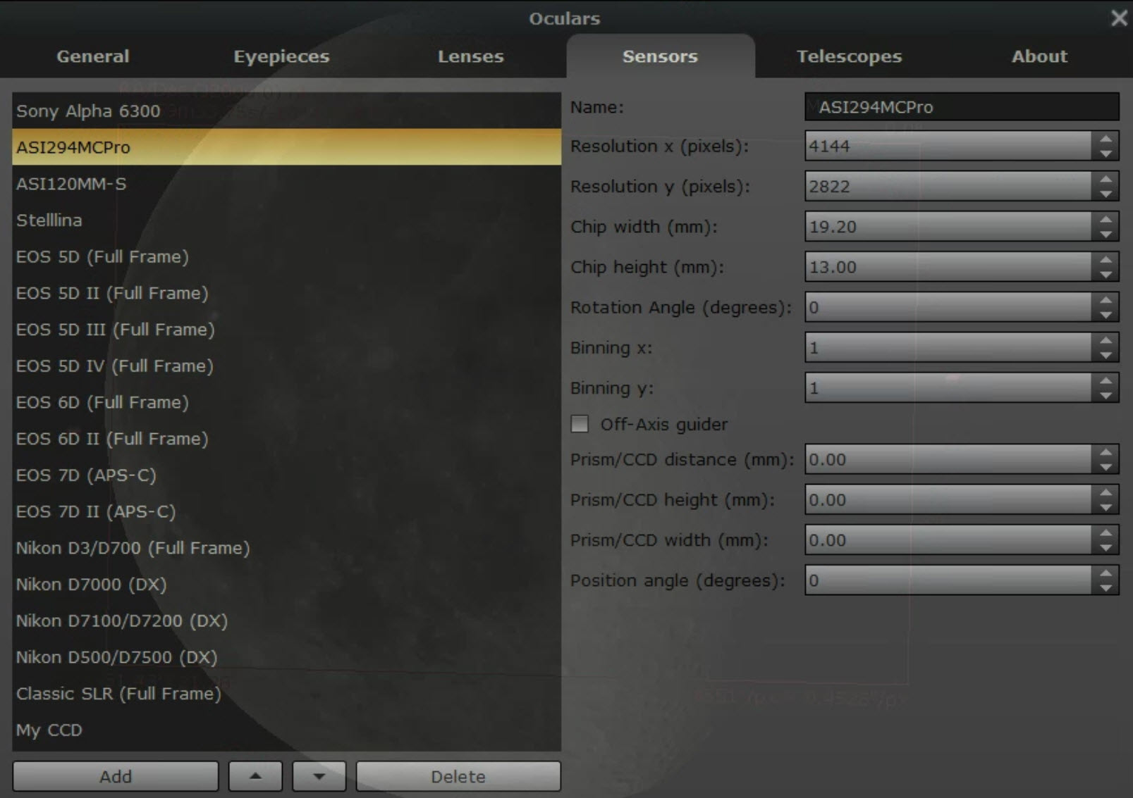 What I really love is the ability to enter information about your equipment. For example, this is my set of entries for my Svbony doublet refractor with a ZWO ASI294MC Pro camera.