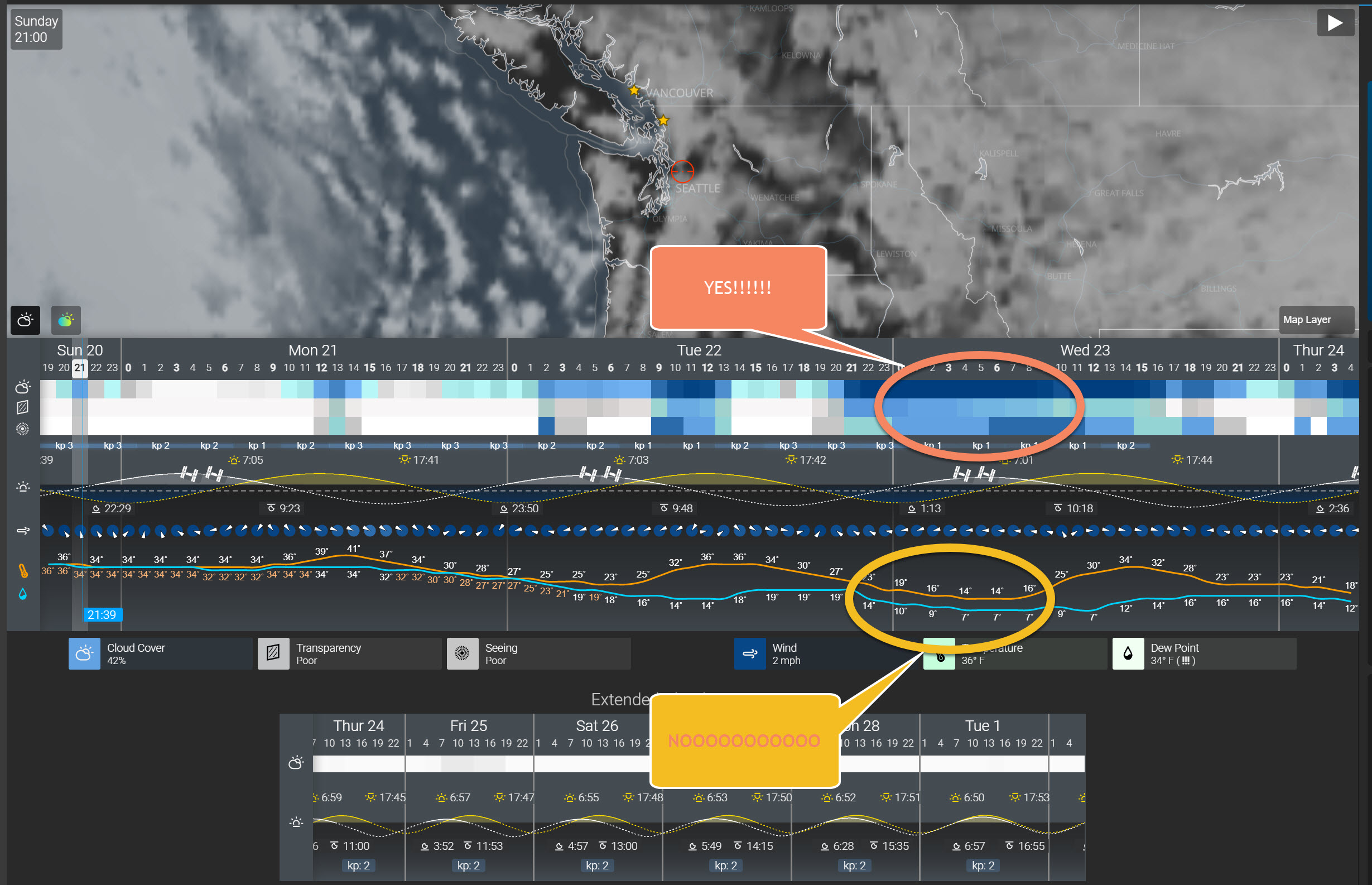 I marked in red the spot that immediately caught my eye. I was almost ready to shout out loud in joy when my eyes scanned down to the area I circled in yellow. Just as I’m dismissing the idea out of simple survival instinct, that other voice says, “Wow, your new telescope should be here Wednesday and, gee, we haven’t had the chance to really test the rig in 14 degree weather!” Oh, and hey, I just noticed the dew point and it’s going to be a dry and fog-free night, so… yeah, it’s an addictive hobby.