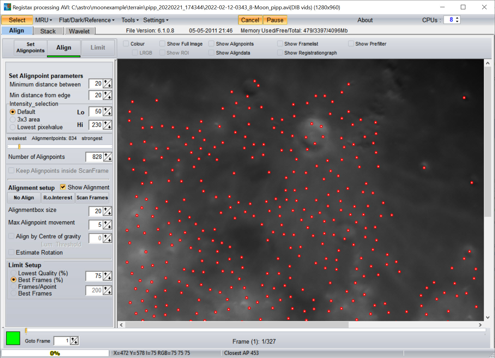 AutoStakkert! can handle terrain just fine, but there’s another free application that many users swear by so I’m sharing it here. It’s been aroud a minute or two (check out the RegiStax6 website). The interface is very similar to AutoStakkert! I’ll go ahead and drag the moon onto the app. Here, the steps aren’t as intuitive, but next I’ll tap “Set Alignpoints”. The result missed a few craters, so I add them by clicking on points in the photograph.