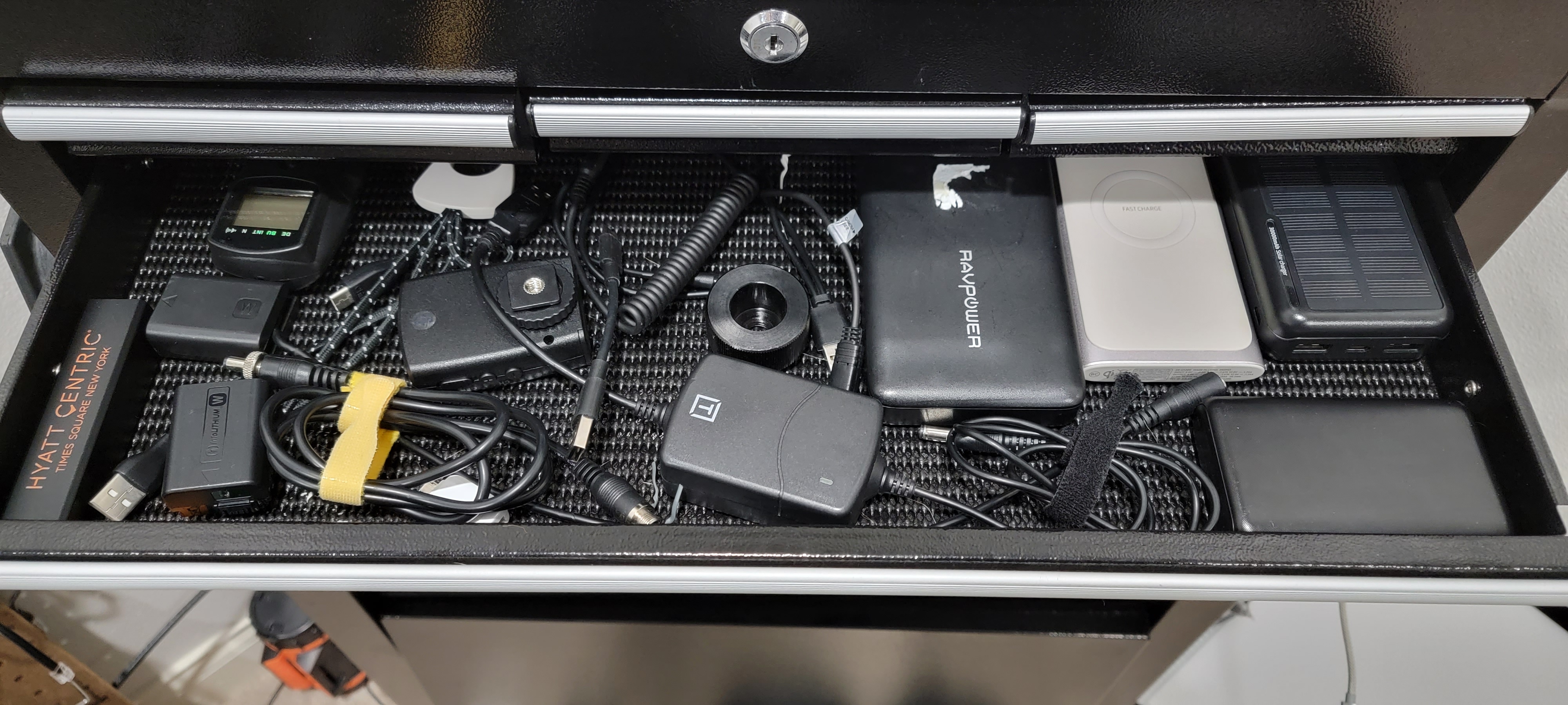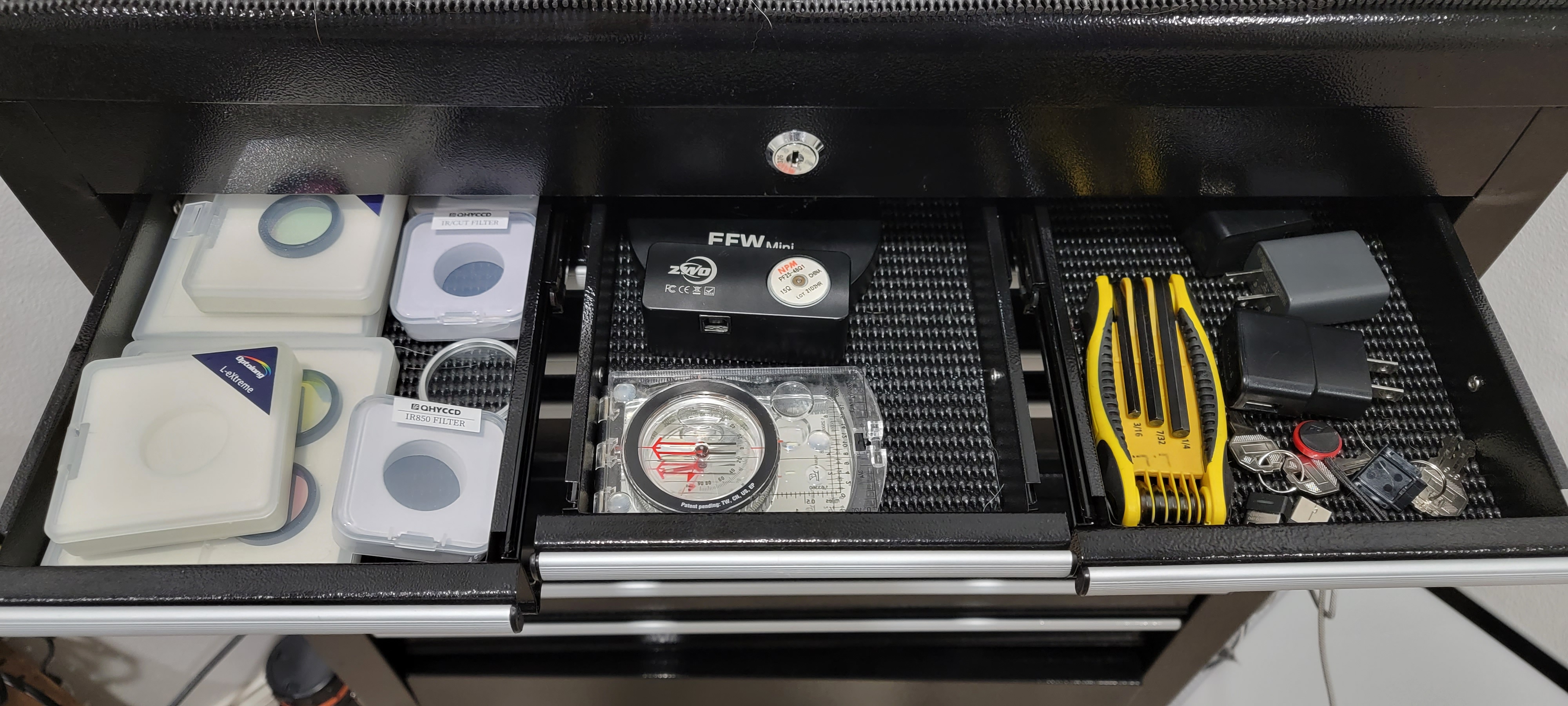 Another great investment for me was a tool chest that I bought on sale from a local home improvement store. Instead of storing tools, I store astrophotography gear. I picked up these bins to organize some items on top.